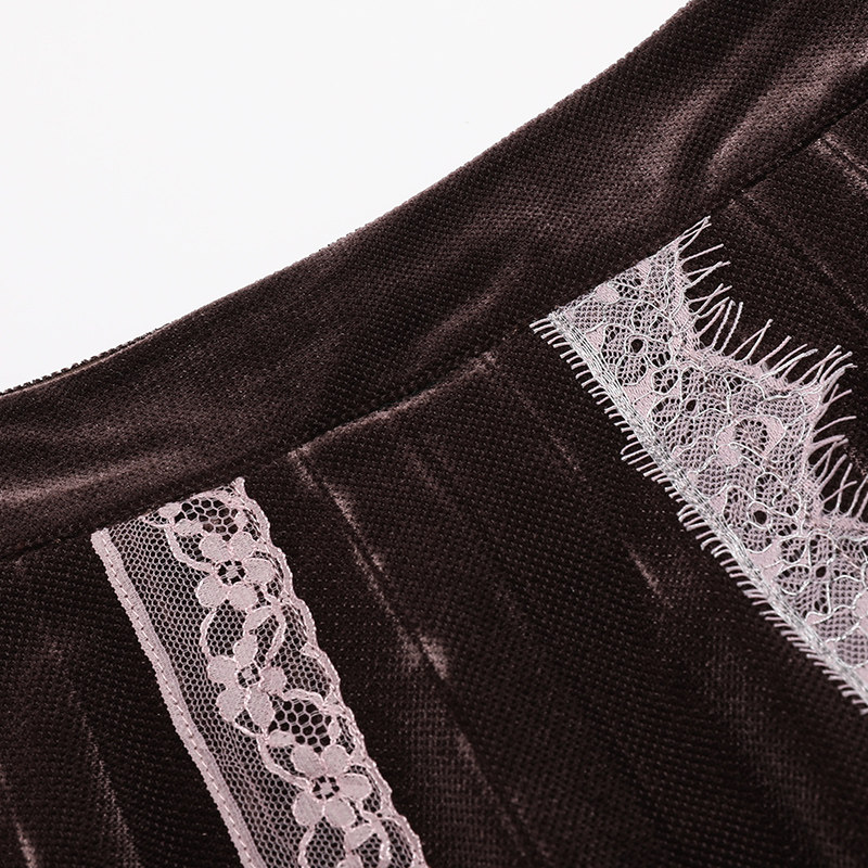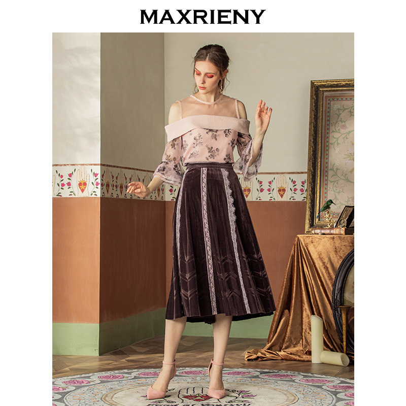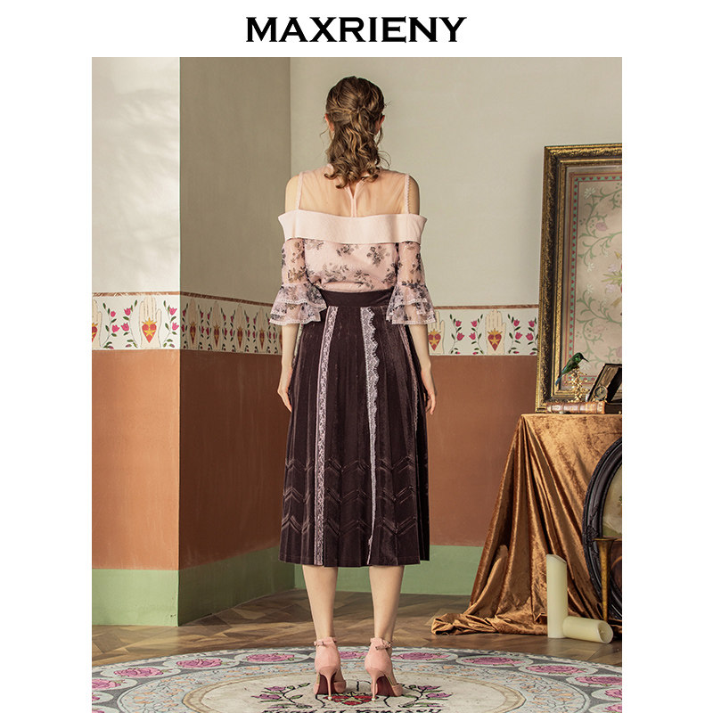 MAXRIENY new fashion vintage Joker high waist pleated skirt lace mesh stitching Medium-length dress women