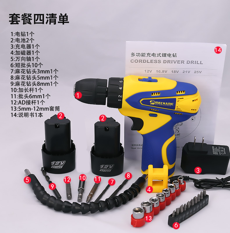 Package 1 (one electric charge)Send 7 drill bits Package 2 (two electric charge) Send 7 drill bits Package 3 (one electric charge accessories) Package 4 (two electric charge accessories) Lithium battery