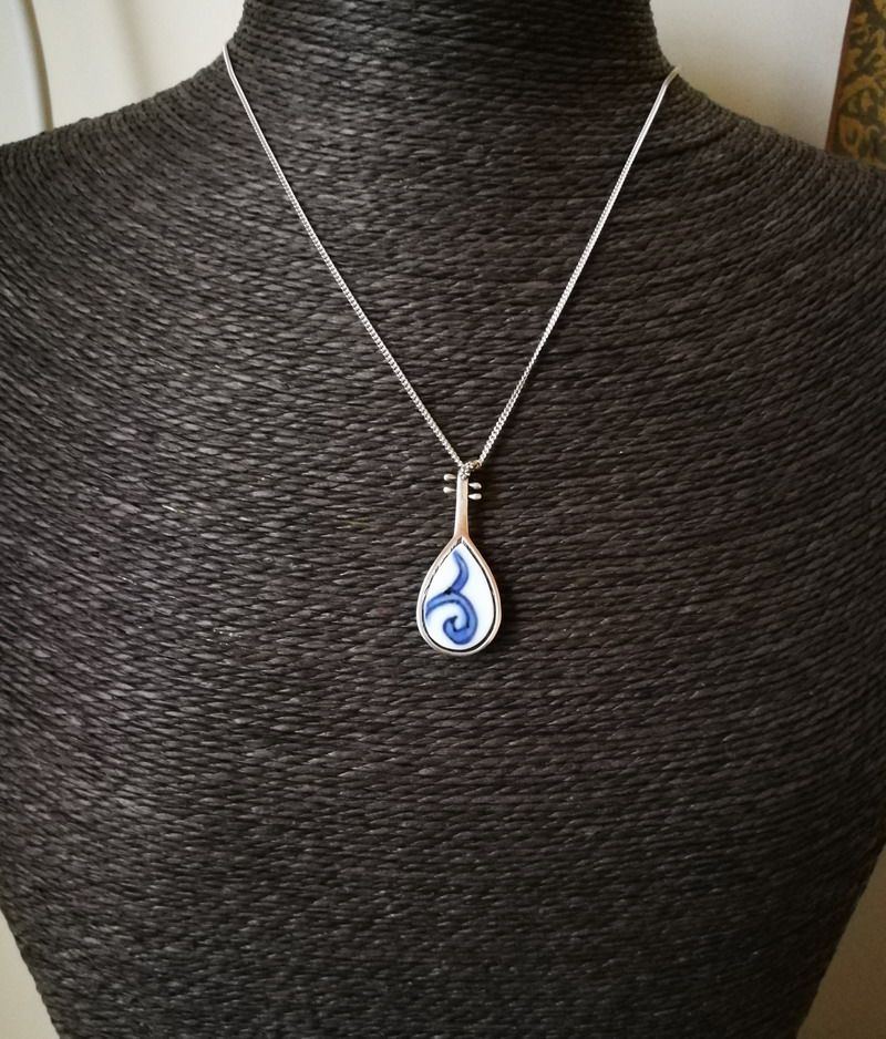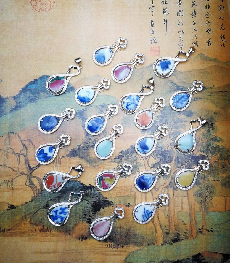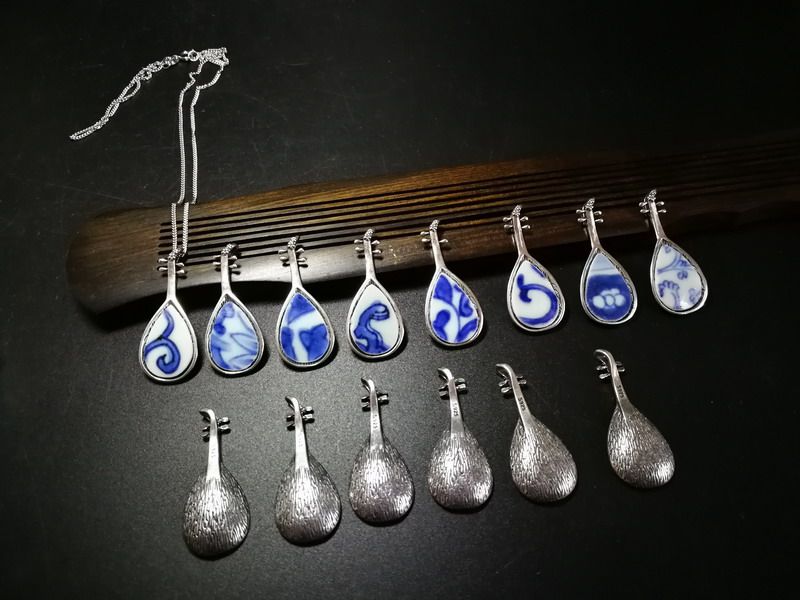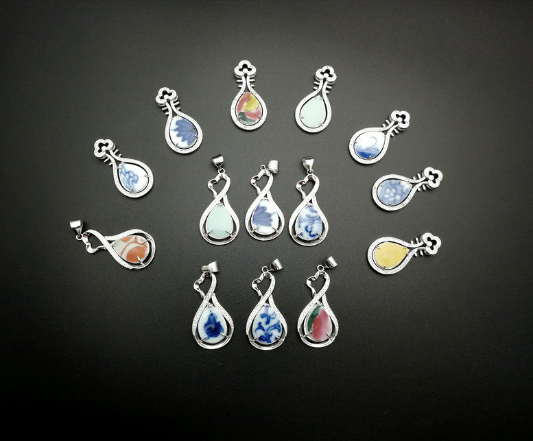 Small pipa small swan 925 silver inlaid with bright clear green flower pink single glazed ancient ceramic sheet pendant