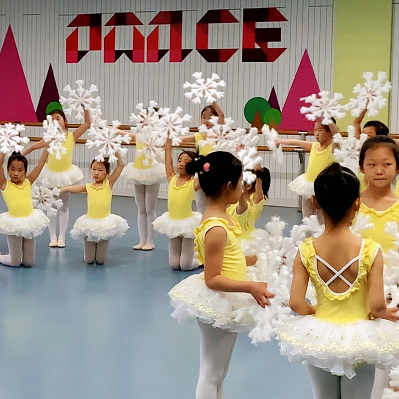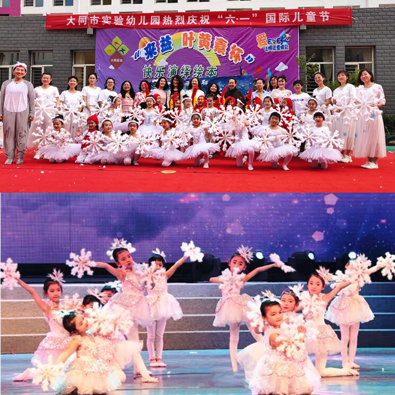 Christmas snowflake decorates children performing dance stage stereo simulation hand with snowflake props Christmas tree hanging