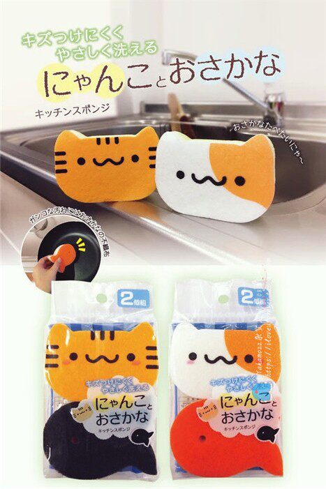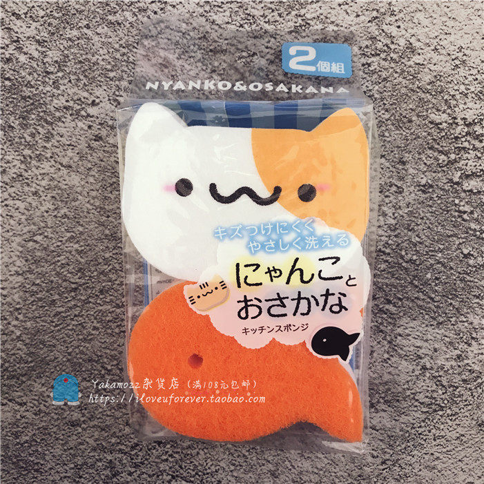 Japanese cute kitty small fish cleaning sponge brush bowls kitchen dishwashing up to oil stain sponge can stand 2 pieces