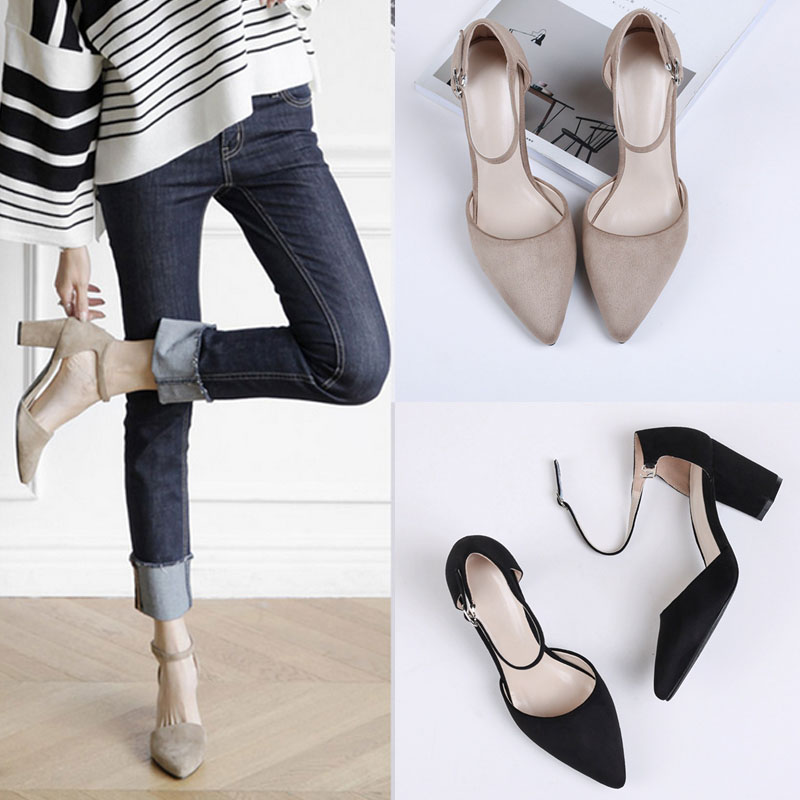 Small fresh high heels girls 2019 spring new one-word buckle French pointed shoes students wild thick heels women's shoes