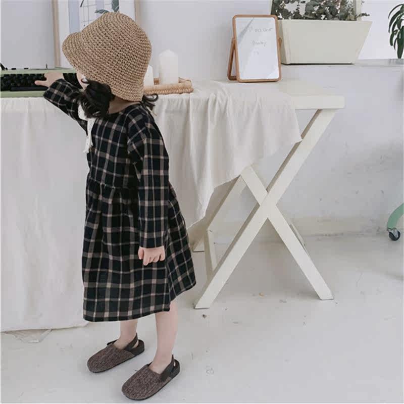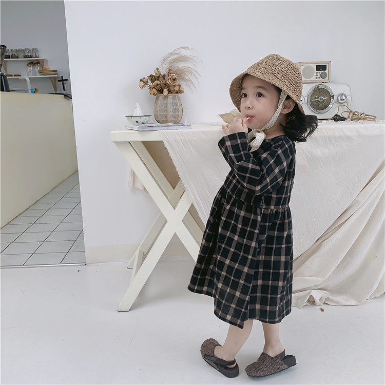 ins exploits spring children's baby Han version retro art cotton numb dress girl plaid long sleeve foreign dress