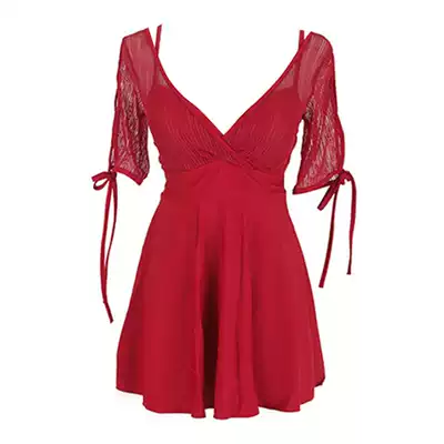 Wine red gauze sleeve lace skirt one-piece black gauze sleeve dress one-piece