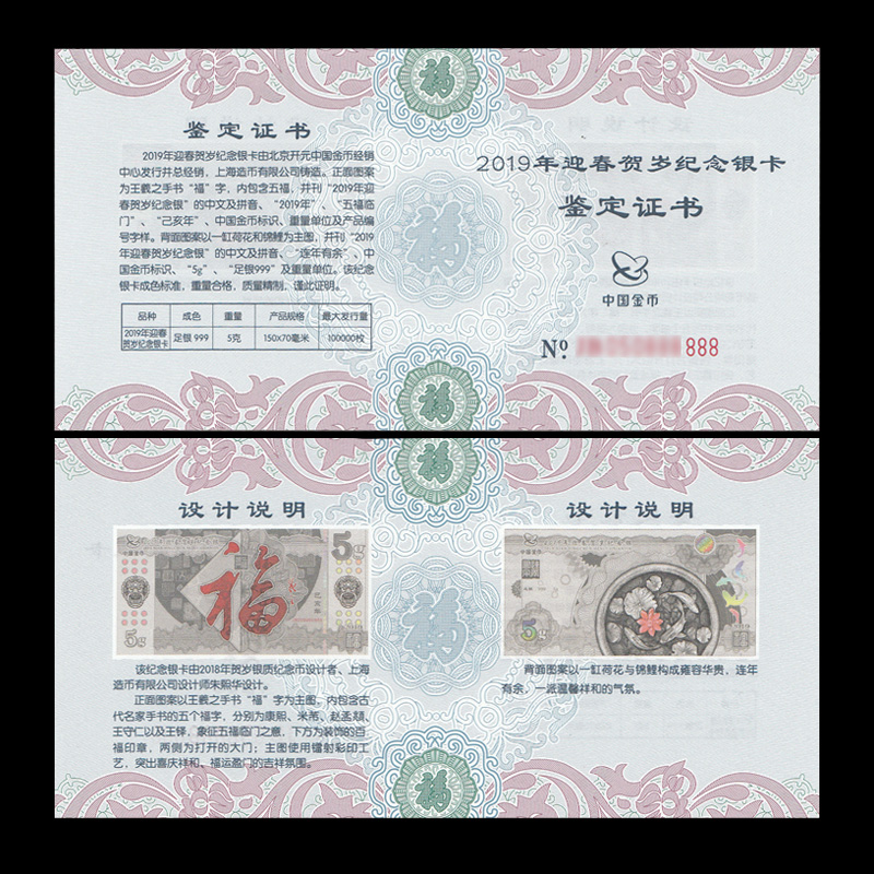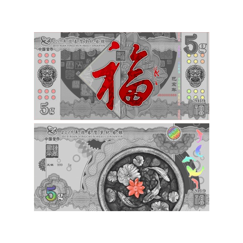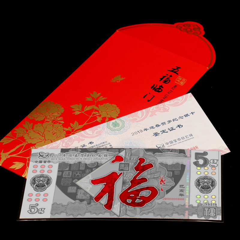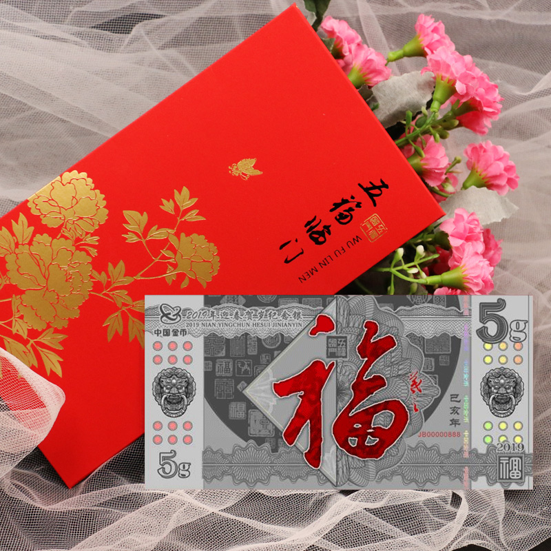 Sky Zhongjin Yingying Spring 2019 Lunar New Year Commemorates 5 gr Silver Vouchers Foot Silver 999 Fu Characters Silver card Lunar New Year's Lunar New Year