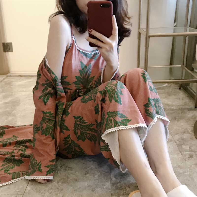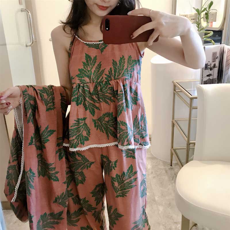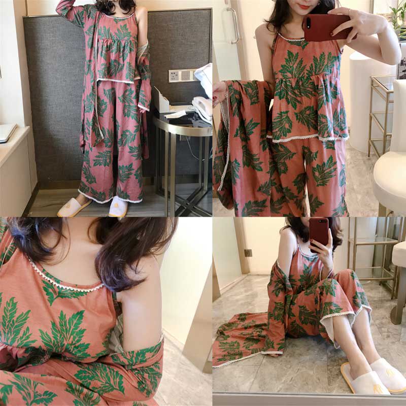ins wind sleepwear women's spring and autumn season three suits Korean version sweet and sexy fresh students long sleeve stay-at-home clothing autumn and winter