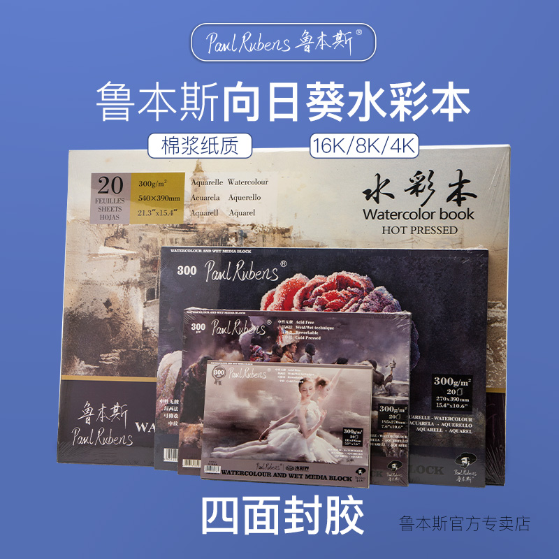 Rubens sunflower watercolor watercolor paper 4K 8K 16K 32K four-sided sealing glue 300g medium-thick watercolor painting book 20 beginner art students sketch book travel blank hand drawn