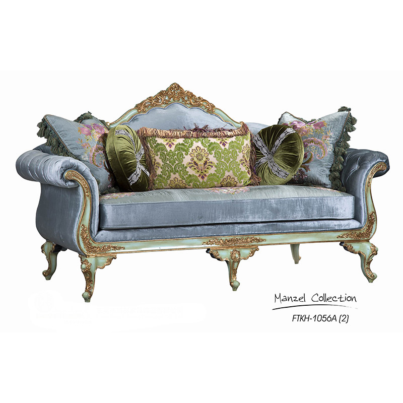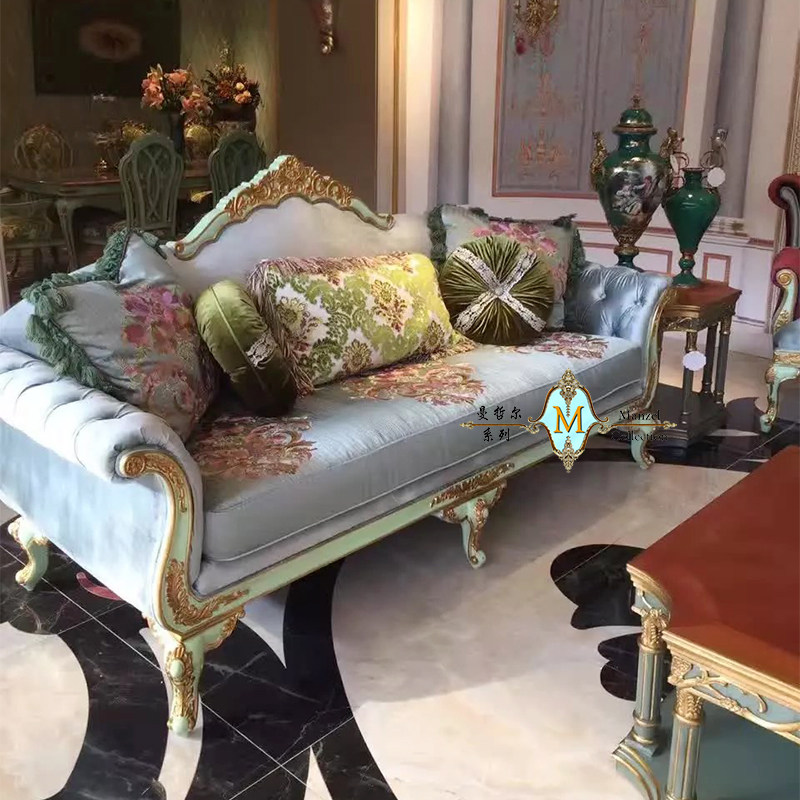 French European retro solid wood fabric sofa combination blue embroidery living room high-end furniture carving luxury villa