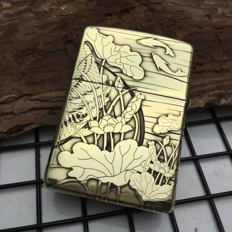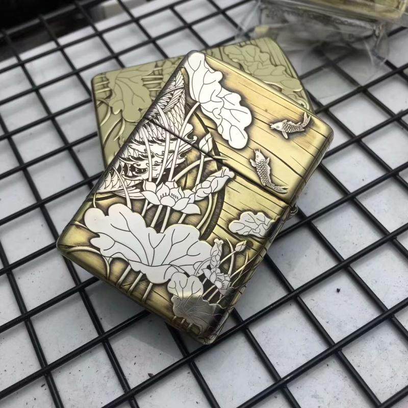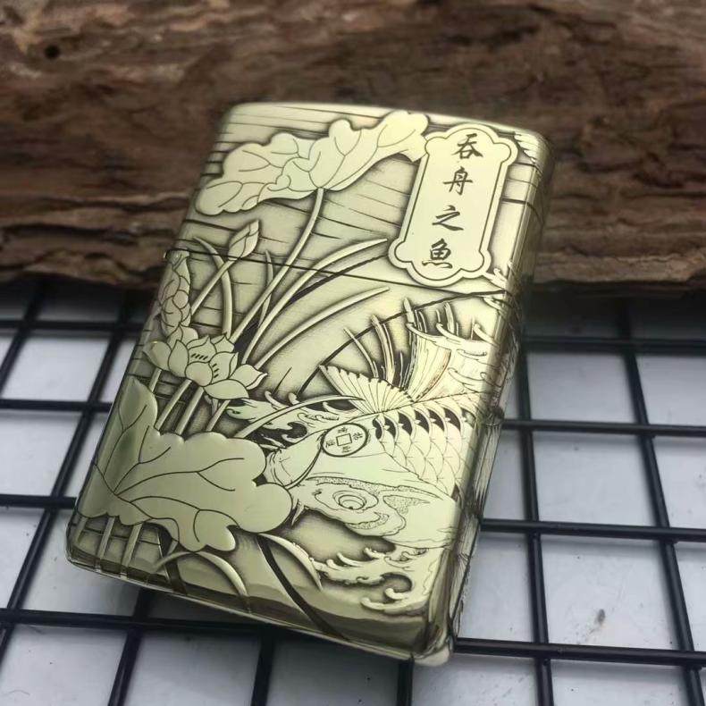 Treasure of zippo windproof lighter pure copper armor engraved on five sides, fish swallowing boats, fish every year, rich fish