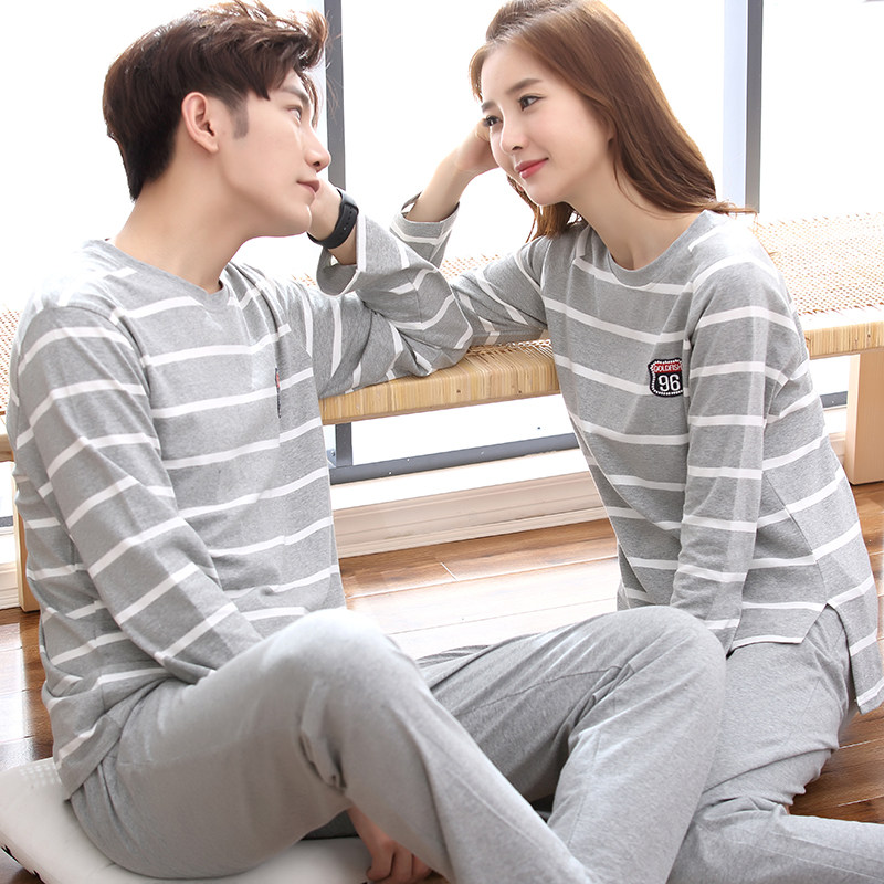 Spring and autumn lovers sleepwear woman long sleeve pure cotton Korean version pyjamas striped male full cotton Home Clothing Suit Autumn winter extras