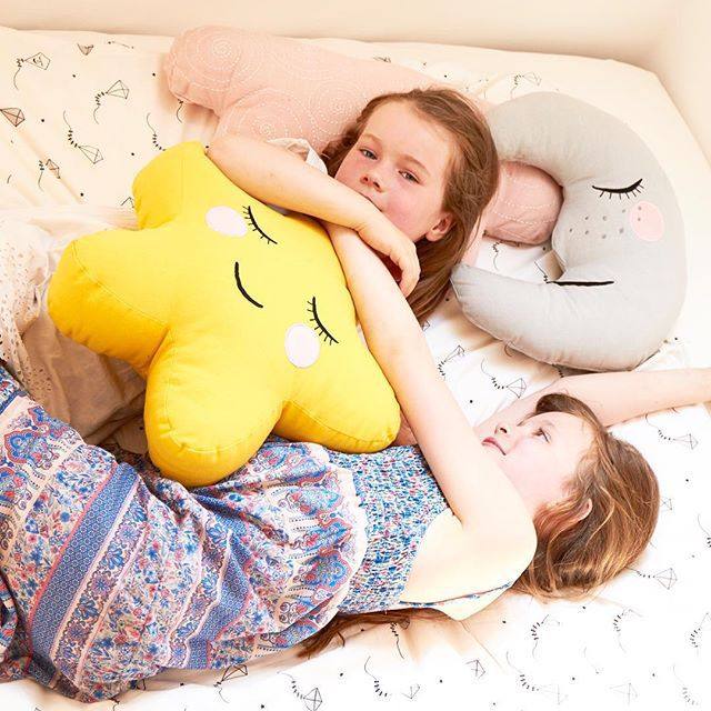 Yellow stars pillow on blue moon pillow pink clouds pillow black house pillow with black elf pillow on blue water droplets
