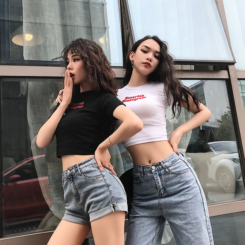 ins sexy tight high waist letter embroidery short-sleeved T-shirt cotton slim fit and slim short crop top female summer