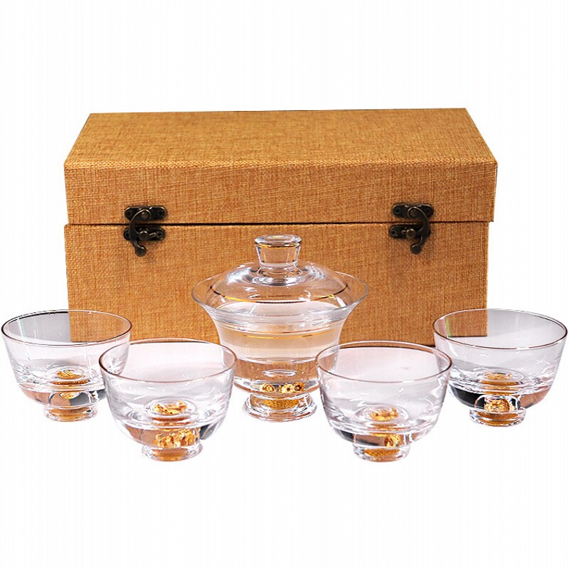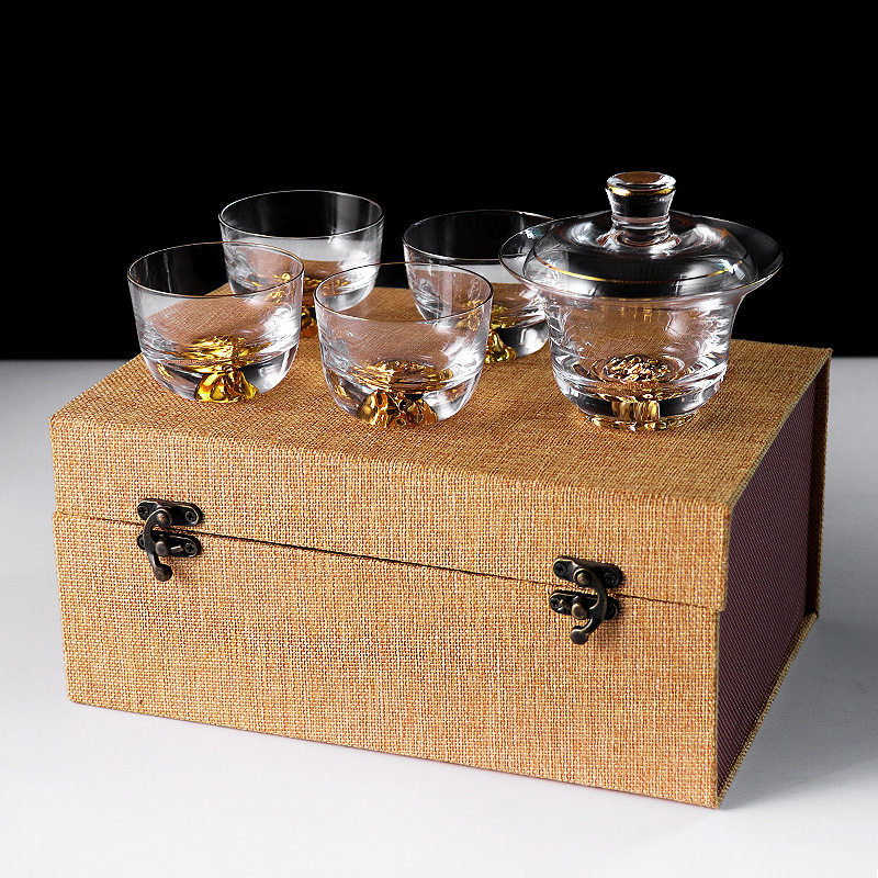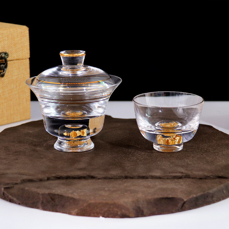 Gold foil tea set, hidden gold teacup, complete cover bowl, home inlaid gold crystal glass Kung Fu tea set gift