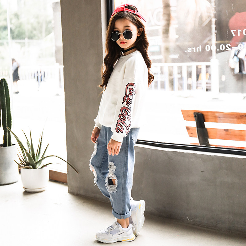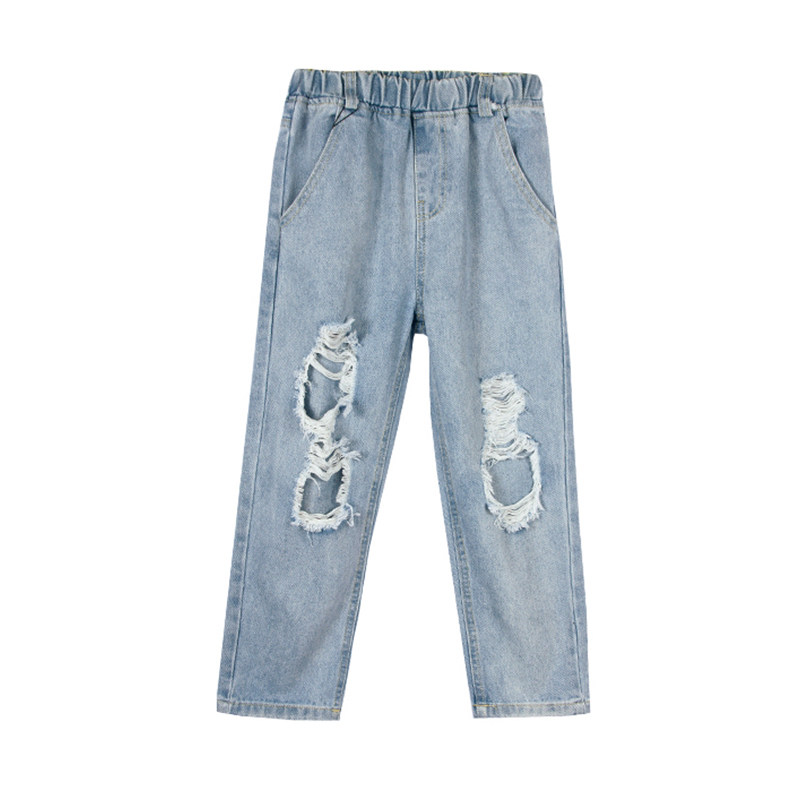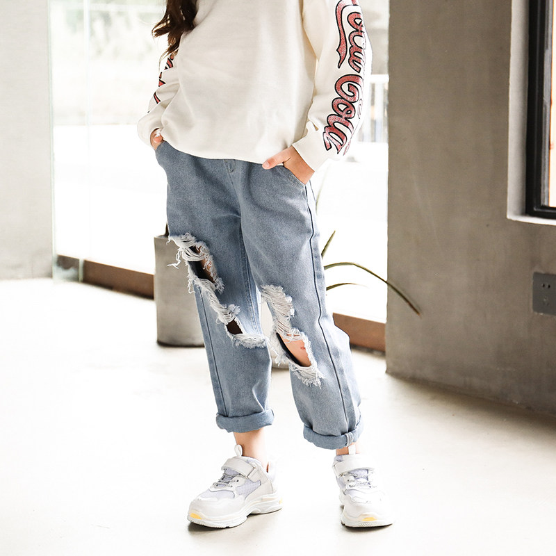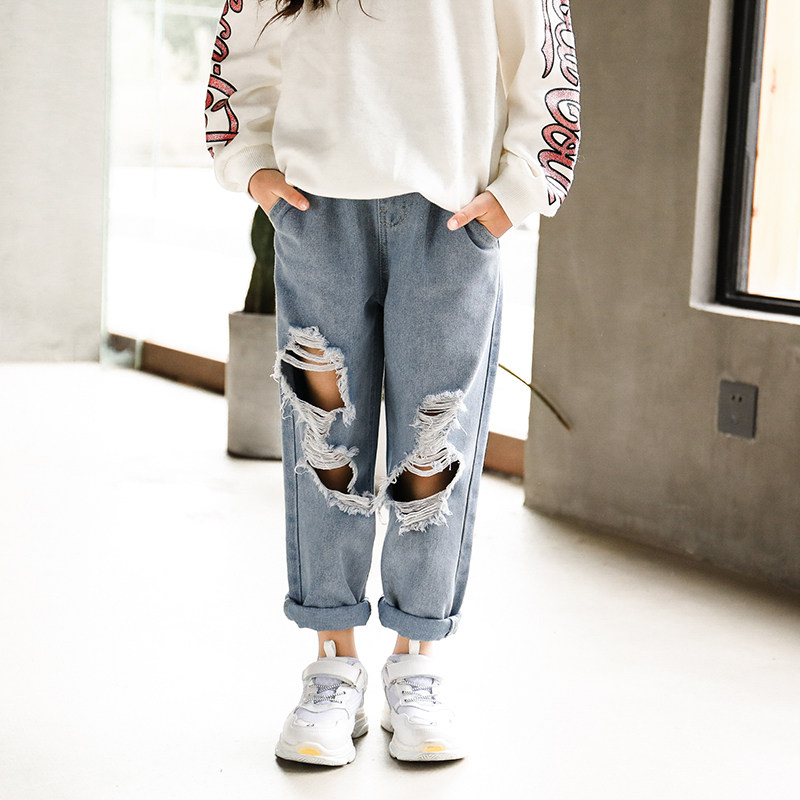 Girls' ripped jeans spring 2022 new Korean version of trousers middle and big children pull side loose beggar casual pants tide