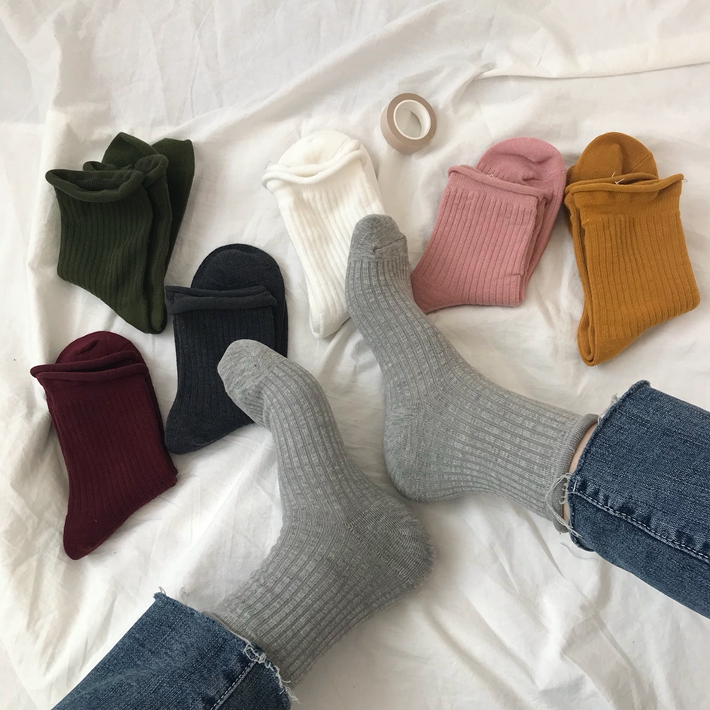Vintage solid color socks Autumn and winter wild middle tube socks Japanese black personality simple socks rolled edge ins tide men and women
