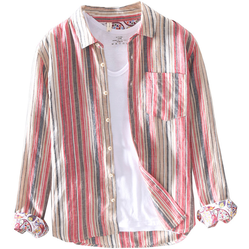 Extremely Hemp Collared Striped Long Sleeve Linen Shirt Men's Day Ensemble Casual Thin Youth Art Loose Cotton Linen Shirt