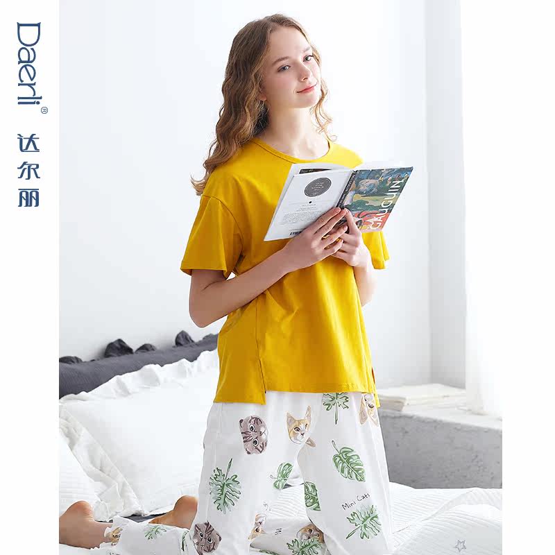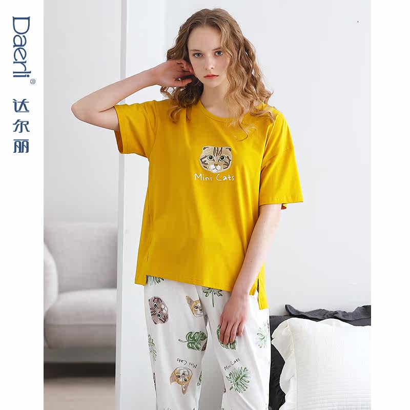 Dalli Summer pure cotton short sleeve head cartoon cute pyjamas woman long pants casual ladies Home Residence Suit Thin