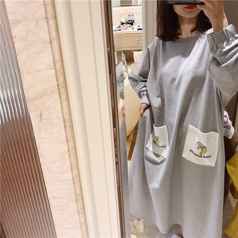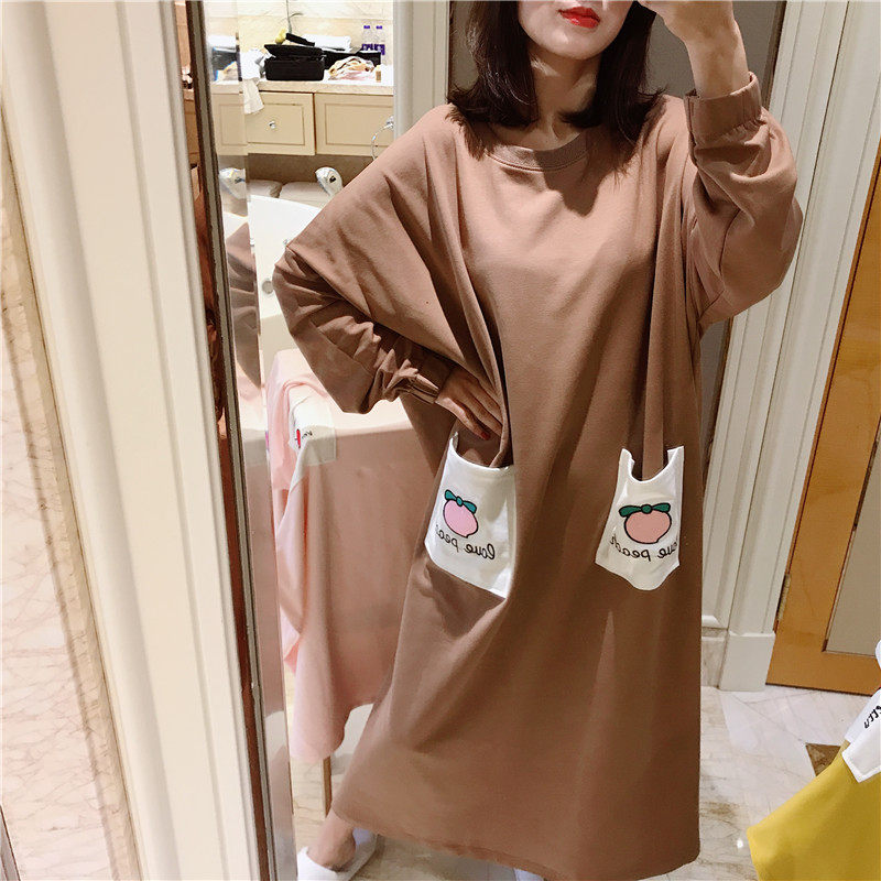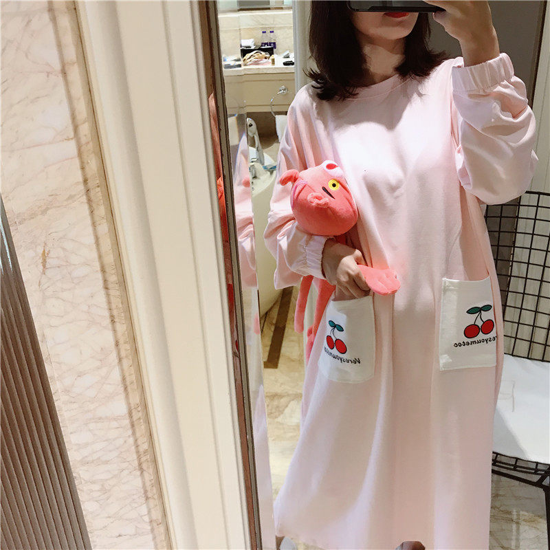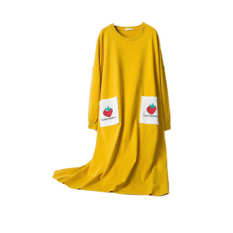 Spring and autumn long-sleeved nightdress terry cotton fruit embroidery pajamas women's loose large size fat mm200 catties home service