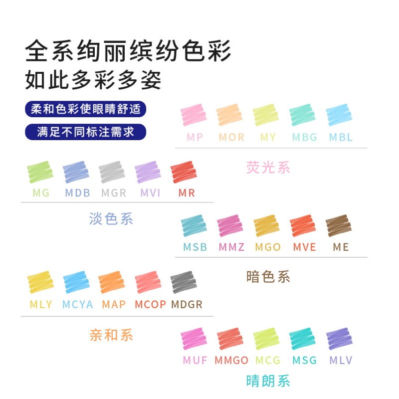 Orange Fluorescent green Dark blue Fuchsia Light green Purple Transparent red Light gray New-Coral Pink(MCOP)New-Apricot Orange (MAP) New-Bright blue(MCYA) New-Lemon
