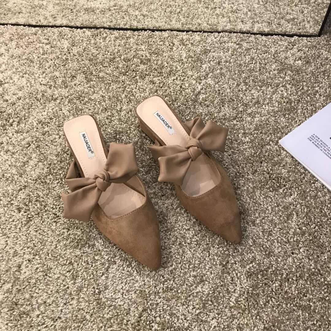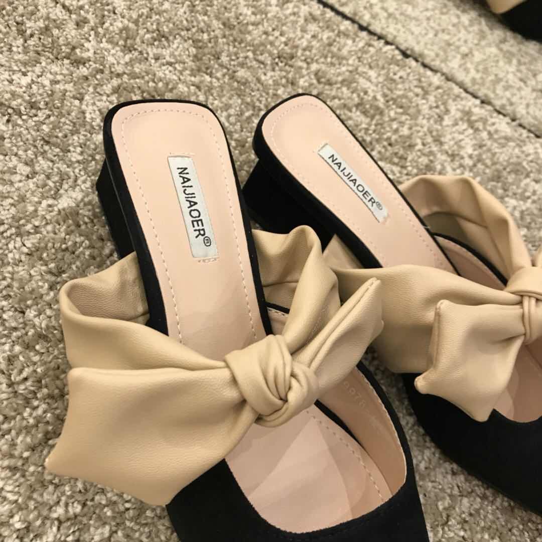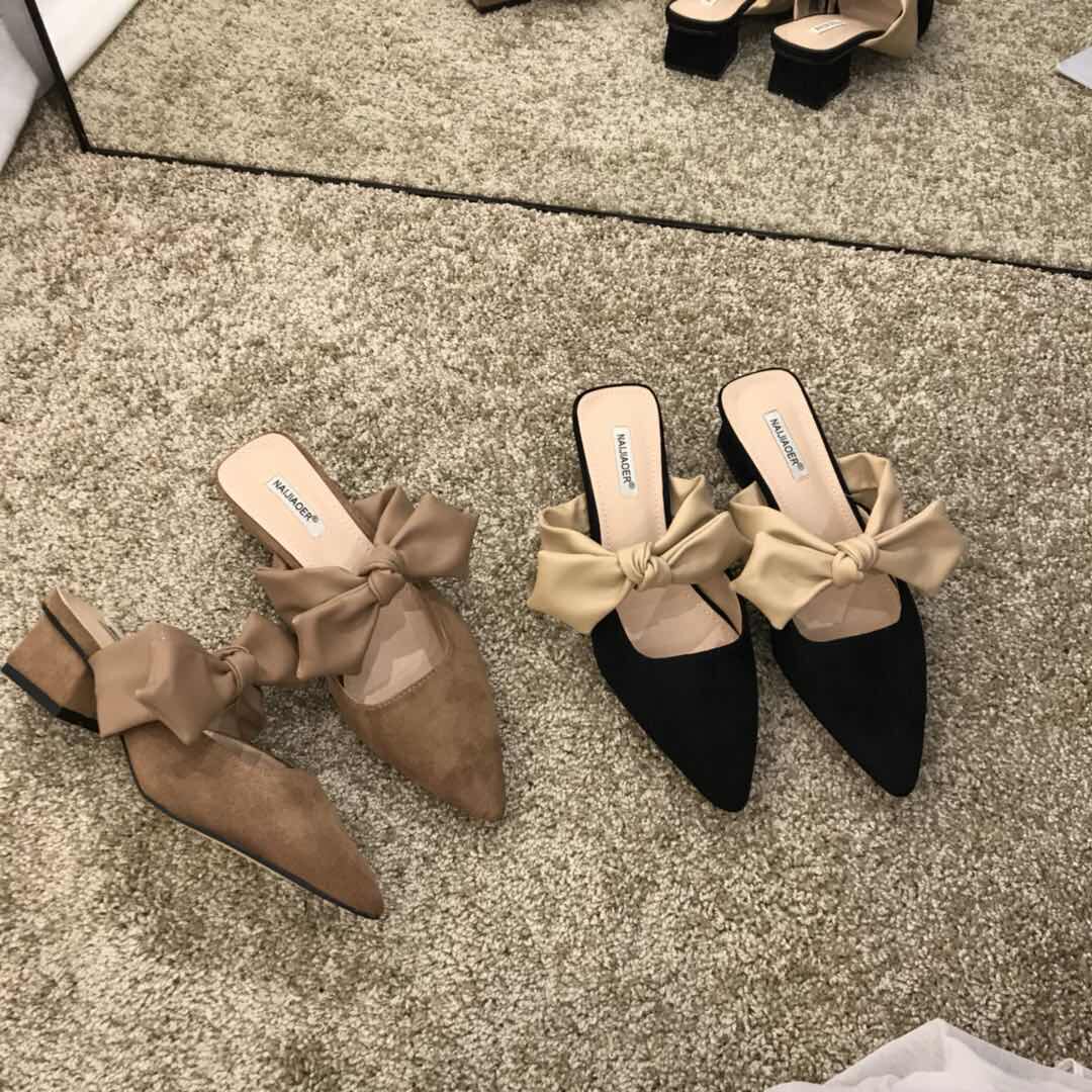French thick-heeled sandals and slippers women's shoes summer high-heeled bow-knot middle-heeled small fragrant wind Baotou half-slipper shoes