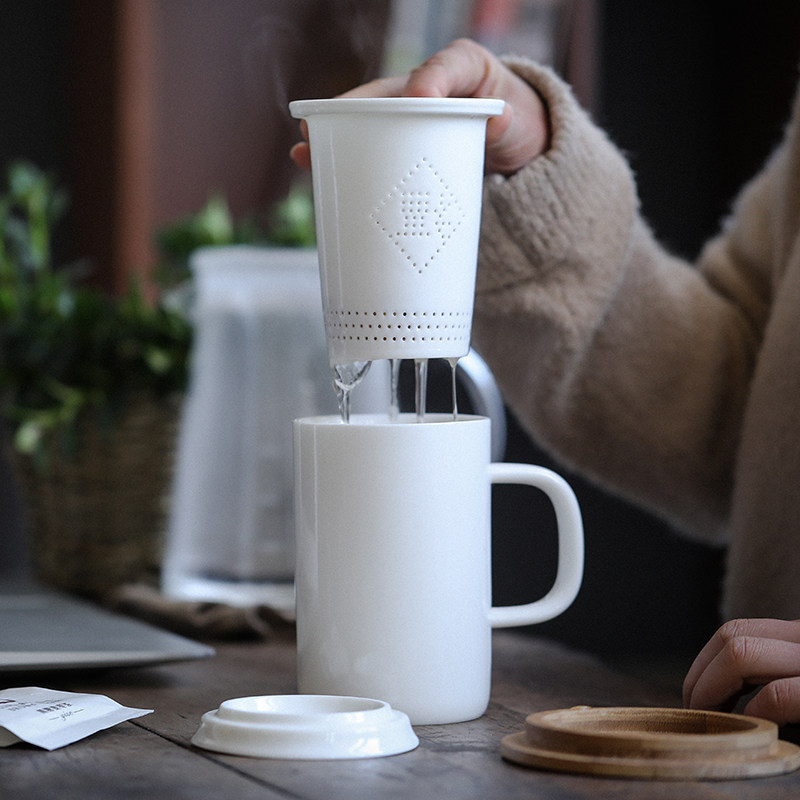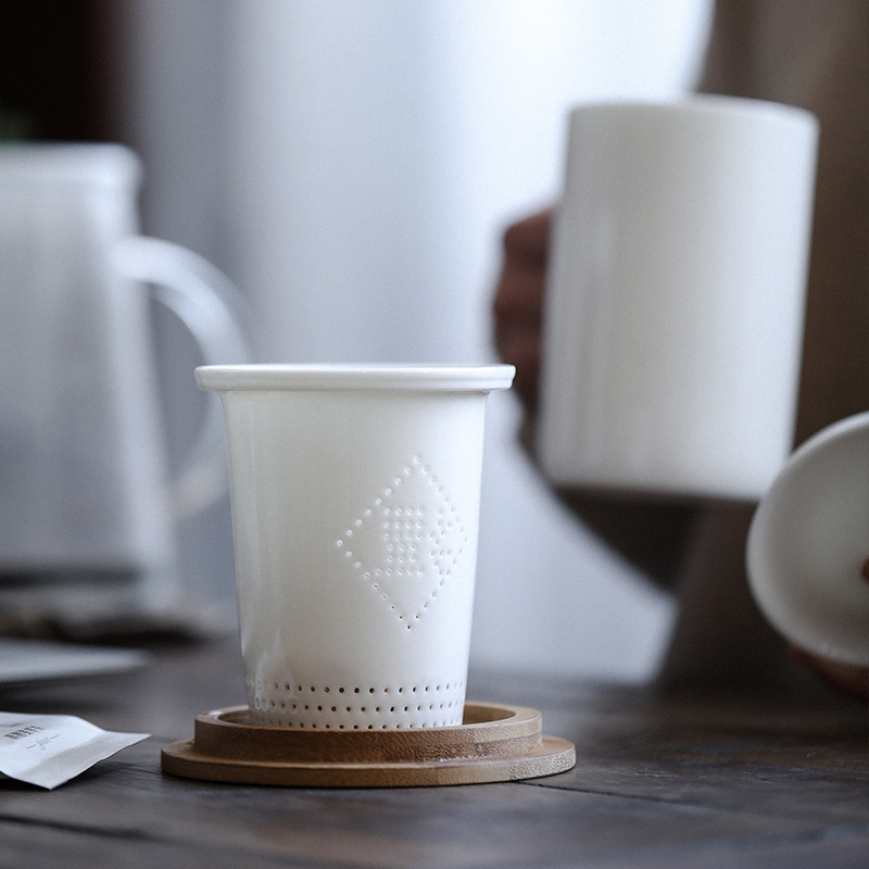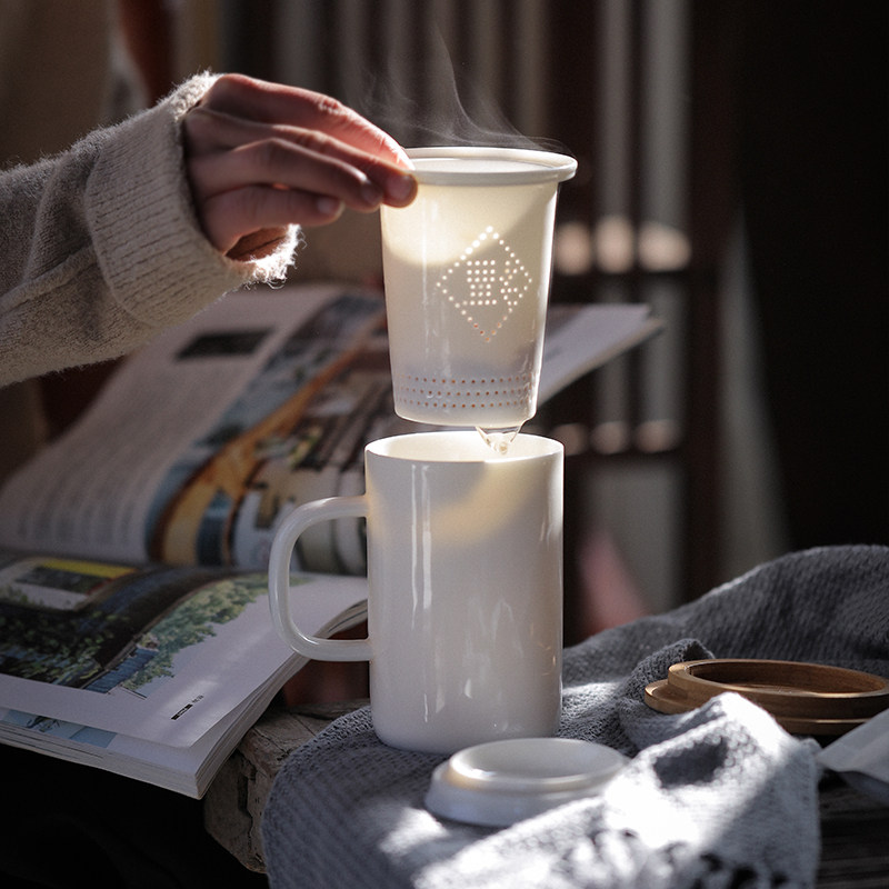 Thick ware Dehua white porcelain cup with lid filter home office personal meeting cup ceramic mug