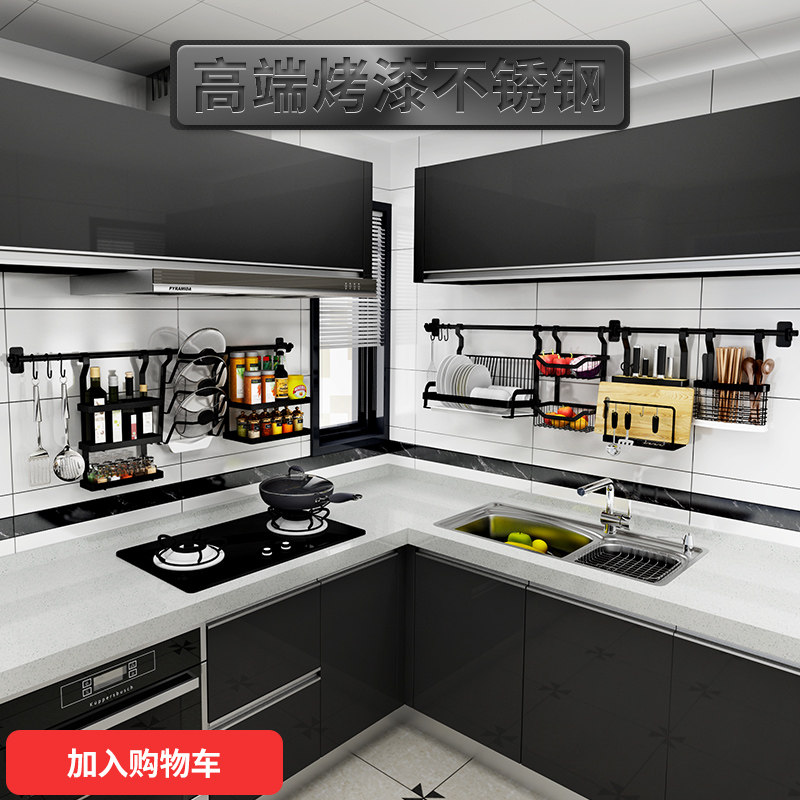 Stainless steel kitchen shelf Wall-mounted hole-free space-saving black drain bowl knife rack storage shelf Seasoning tank rack