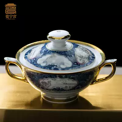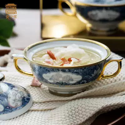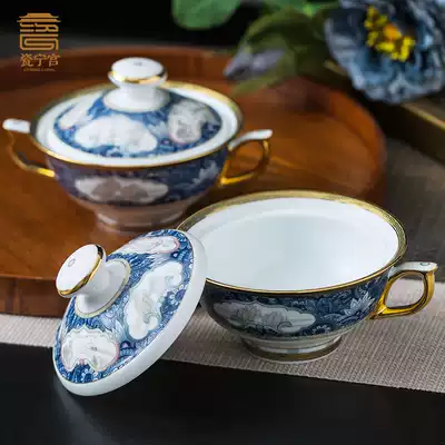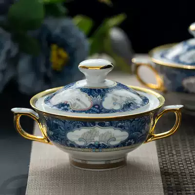 Gold blue and white enamel ribbon cover ceramic stew cup water stew bird's nest small dessert Cup household soup cup Buddha jump wall