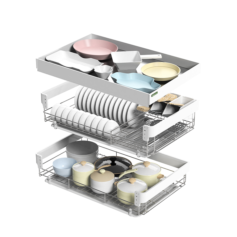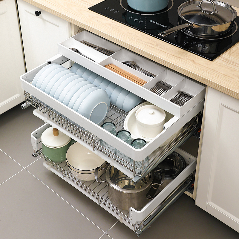 Echi Kitchen Cabinet 304 Stainless Steel Double Drawer Type Seasoning Bowl Basket Built-in Storage Pots and Pans Dishes Pull Basket