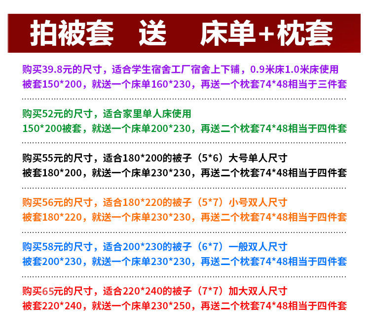 150*200cm for bed sheet 1 pillowcase 150*200cm for big bed sheet 2 pillowcases for 180*200cm for bed sheet 2 pillowcases for 180*220cm for bed