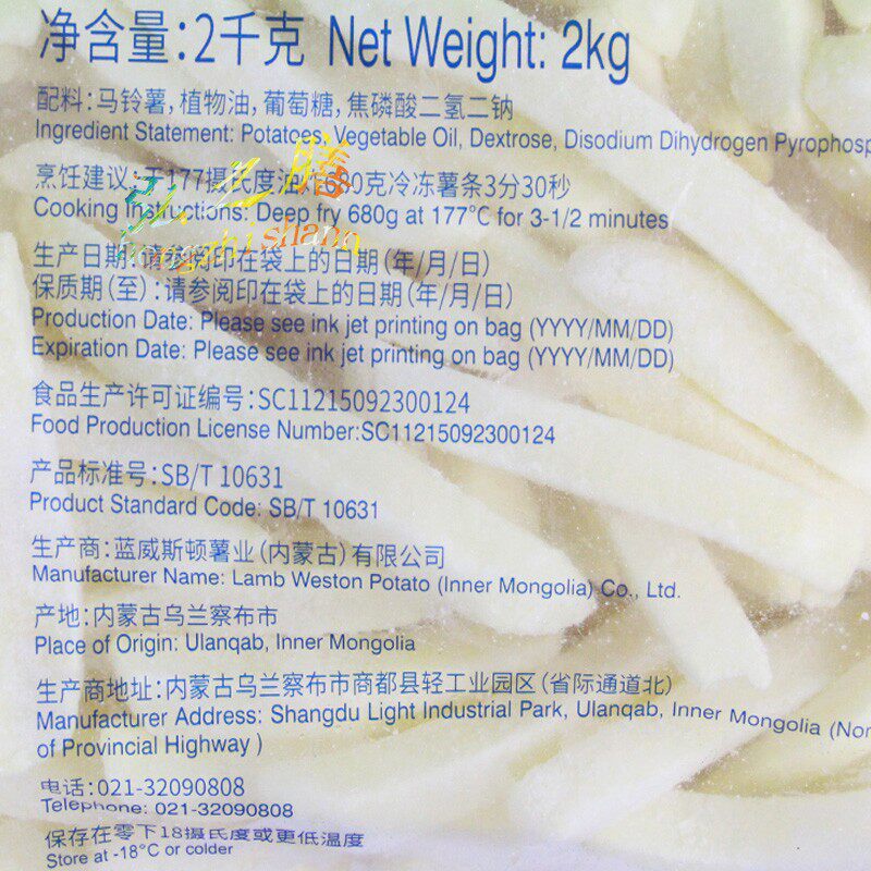 Blue Weston Fries Fries Frozen Semi-finished Products Fried Snack Foods Coarse Fries Commercial American Rough Fries 2kg