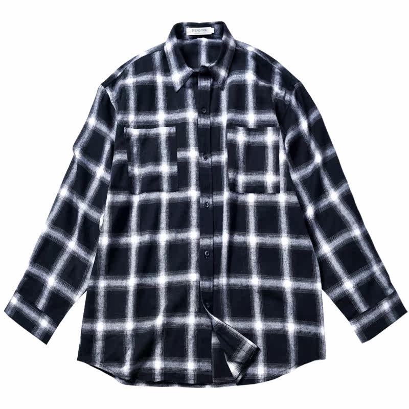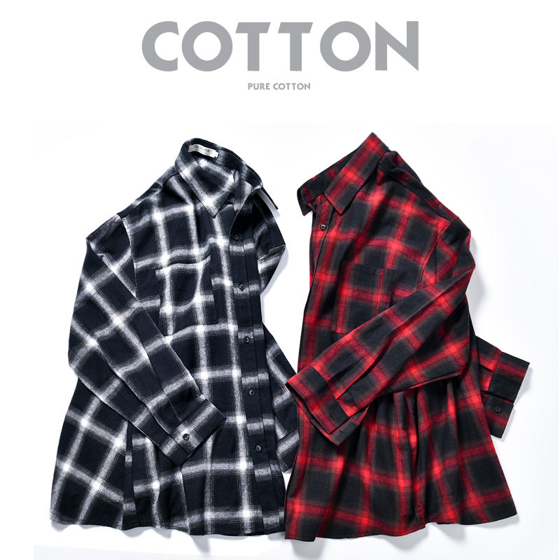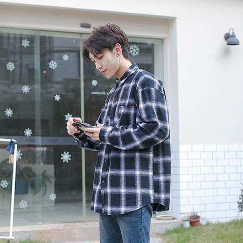 ins men's cotton Hong Kong style long-sleeved student loose Korean shirt couple casual boys cotton plaid shirt