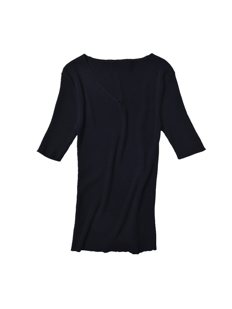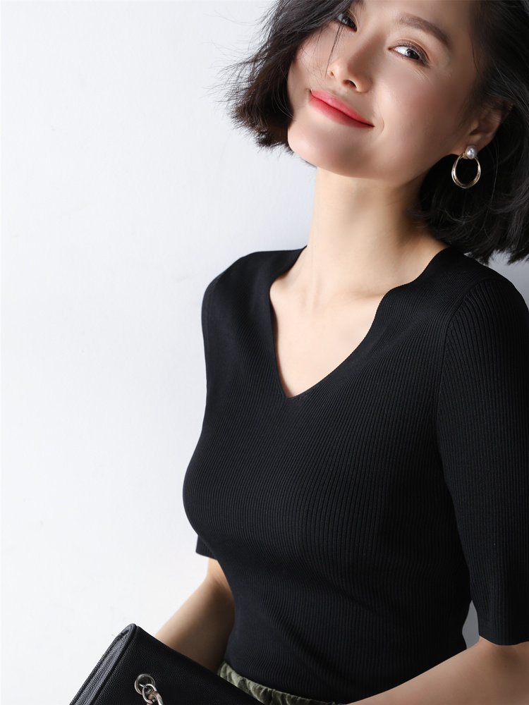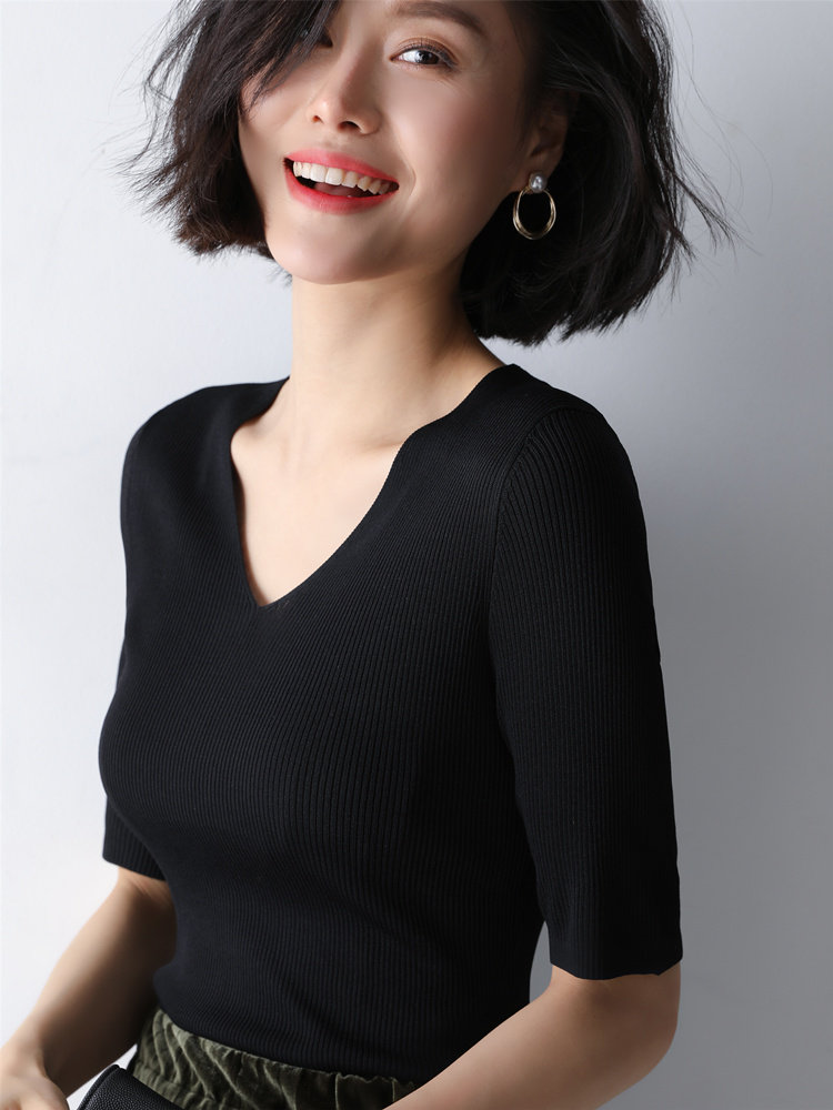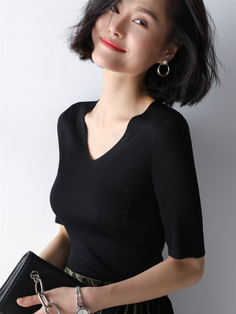 Ice silk knitwear women's short sleeve slim 2022 new black underwear half sleeve v-neck knit shirt top thin