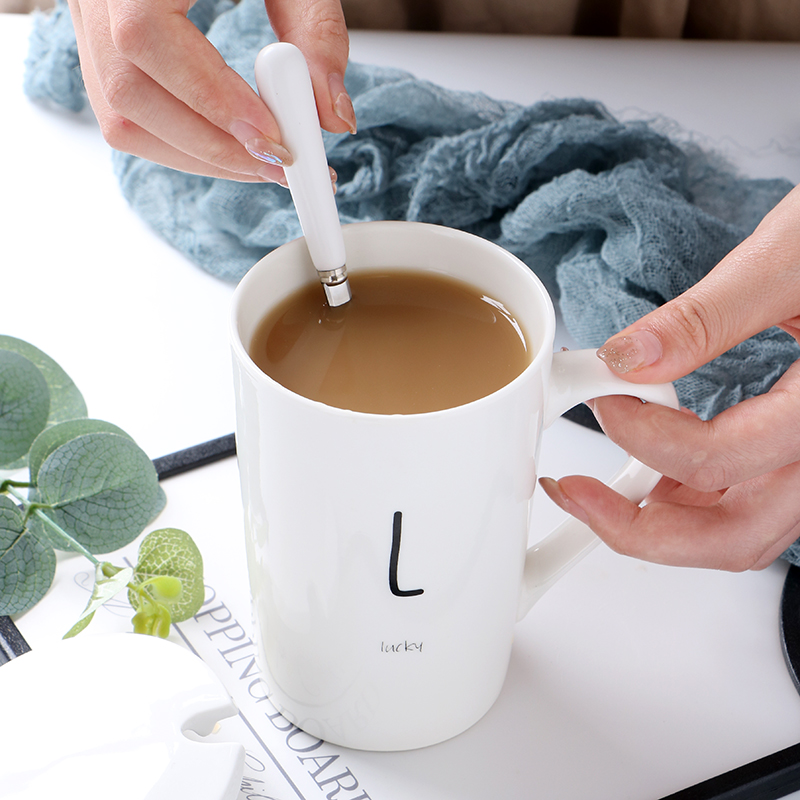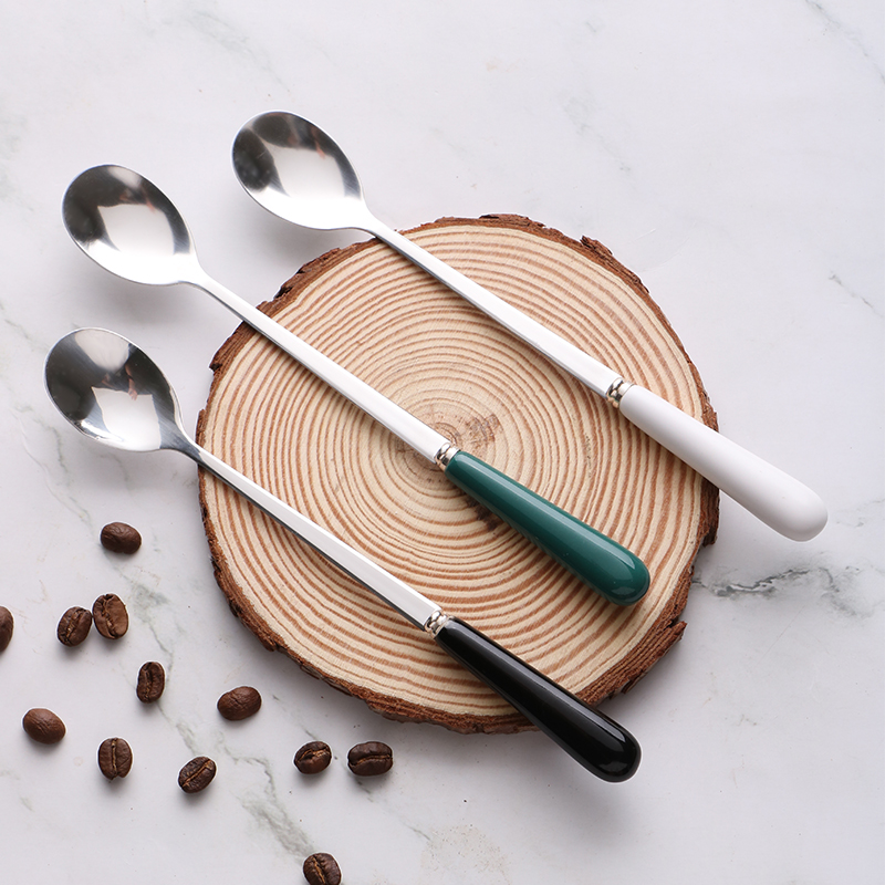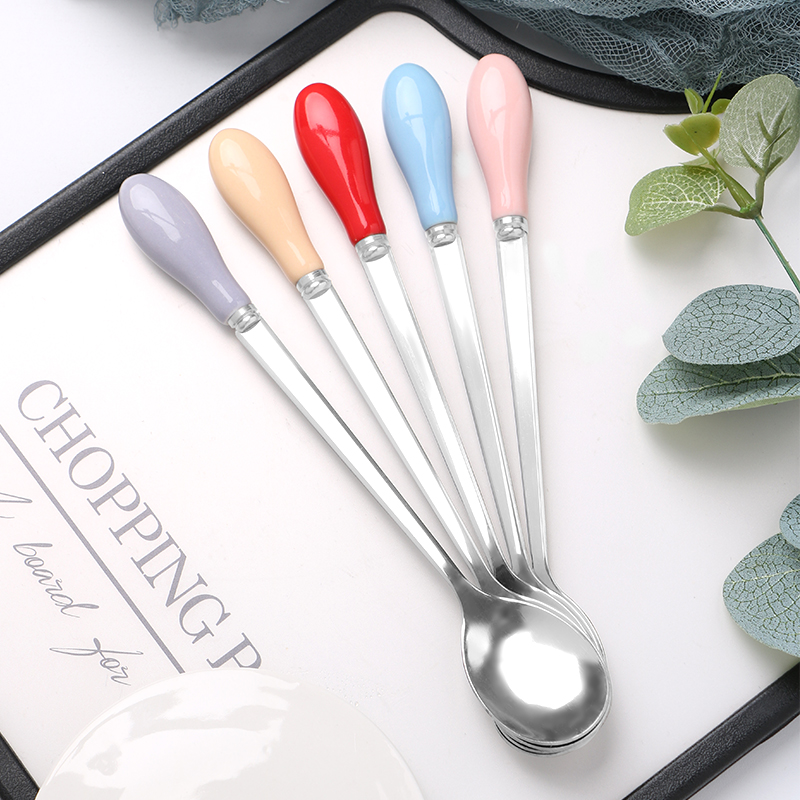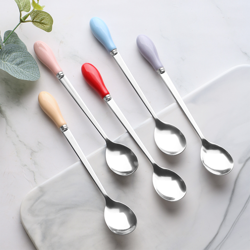 Personality creative long handle ceramic handle stainless steel mixing spoon Cute spoon small fork Simple black and white coffee spoon