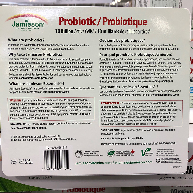 Canada Jamieson bodybuilding 3-year-old children and adults 10 billion active probiotics 130 grains