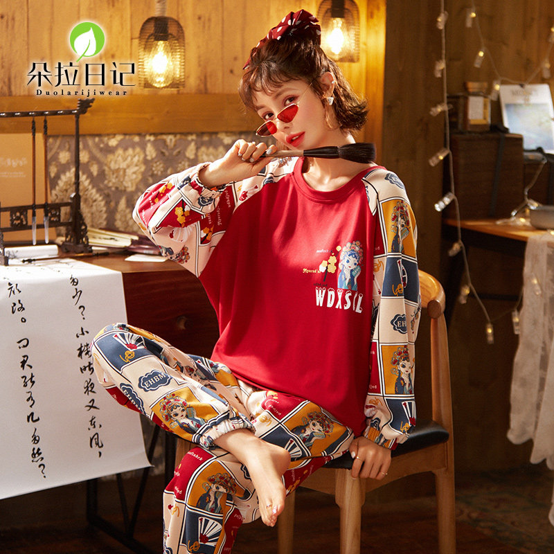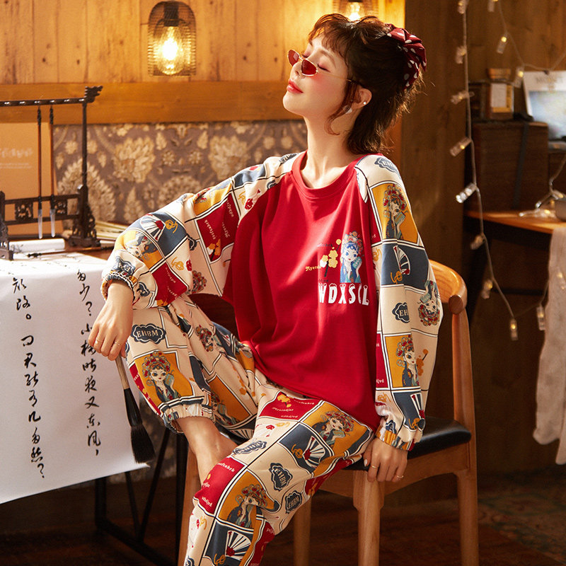 Teenage Girl Sleepwear Woman Spring Autumn Winter Long Sleeve Round Neckline Neckline Full Cotton Section Student Guochao Cartoon Sweet Beauty Pure Cotton Home Clothes