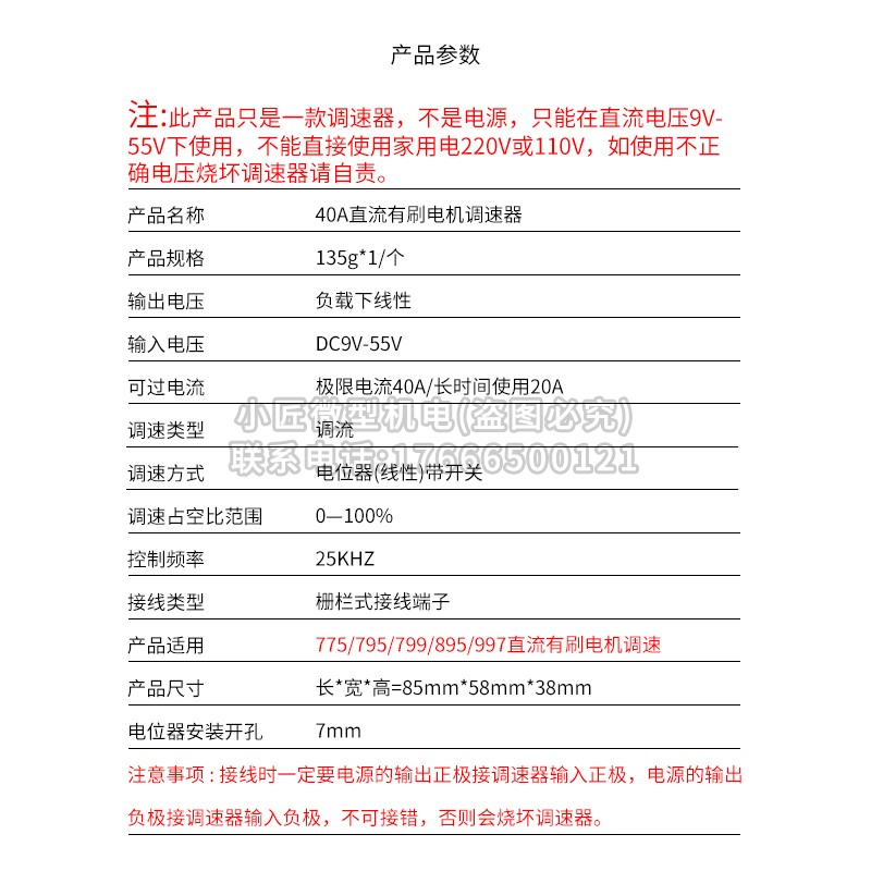PWM stepless speed controller DC brush motor 12V24V48V motor reduction variable speed control 40A with switch