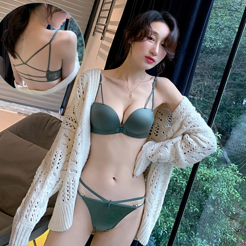 Close the pair of breast front buckle beauty back sexy underwear set Small chest gathered without trace no rim deep V thin underwear women
