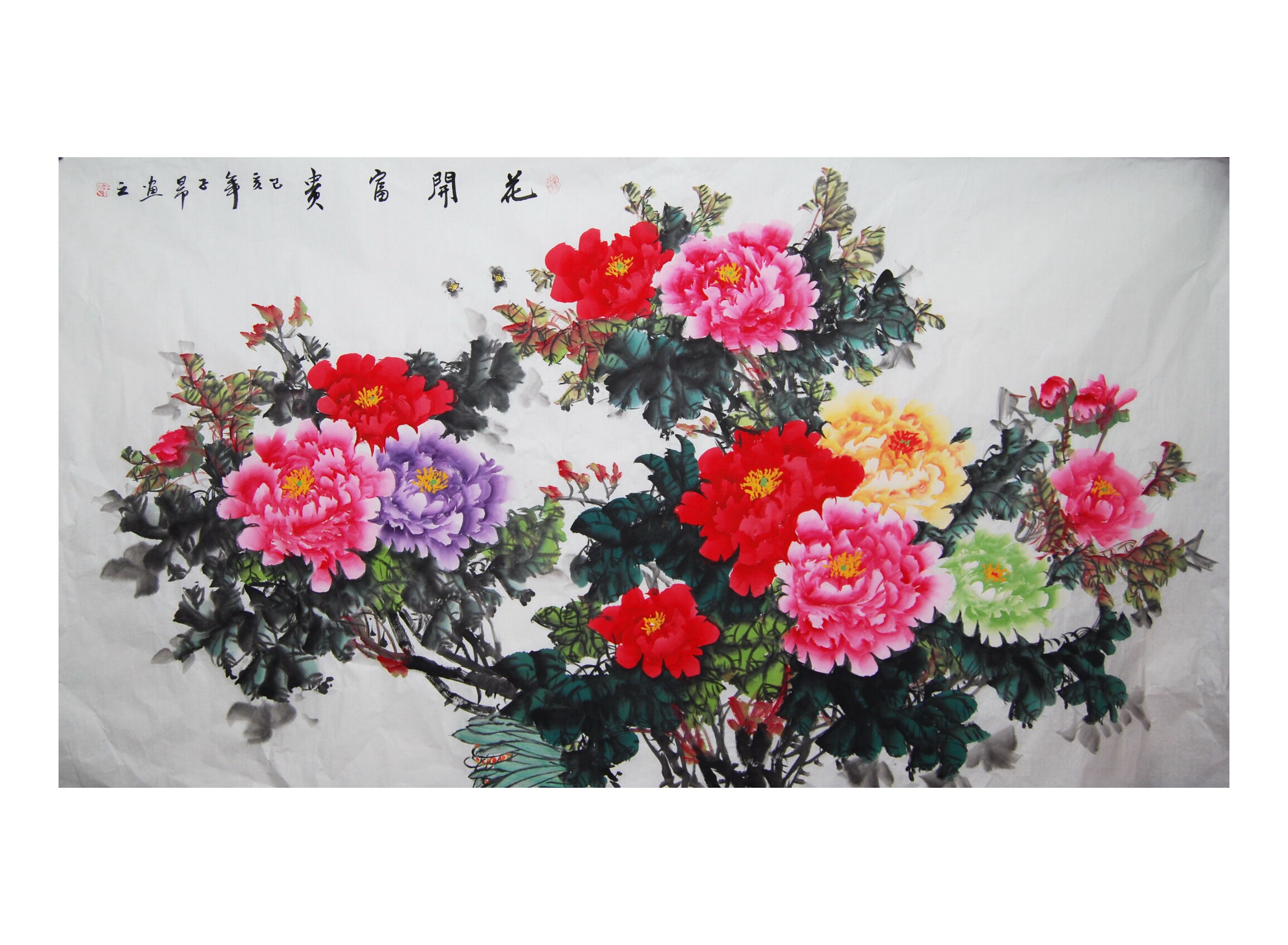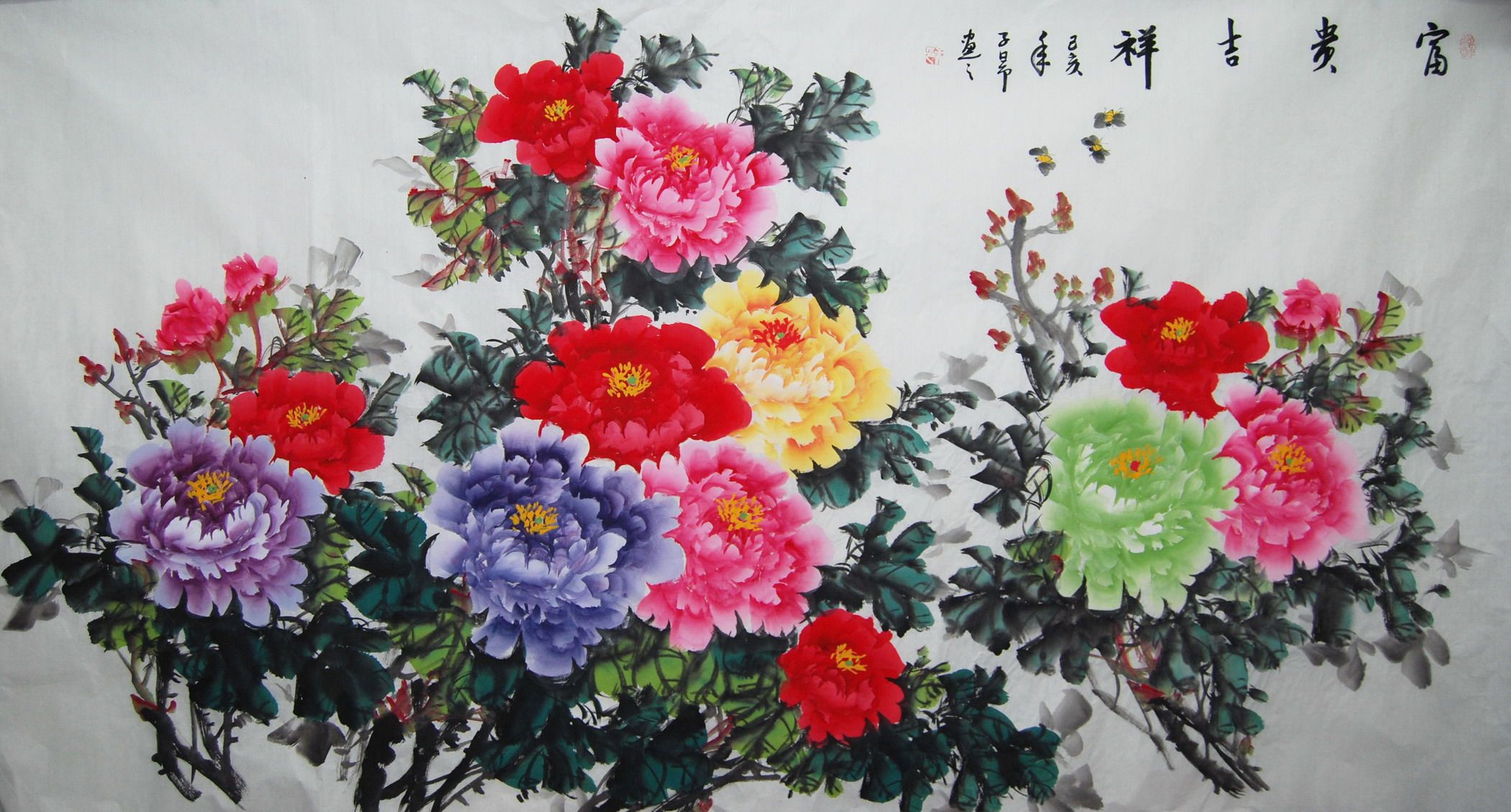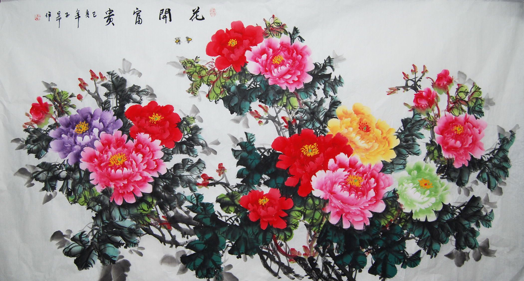 Special offer pure hand-painted six-foot Chinese painting flowers and birds flowers blooming rich peony calligraphy and painting living room office decoration feng shui style painting