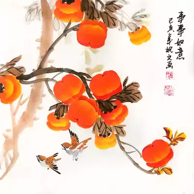 Special promotion Hand-painted authentic Chinese painting Ink painting flowers and birds living room porch sketch Doufang persimmon picture Everything is wishful 40