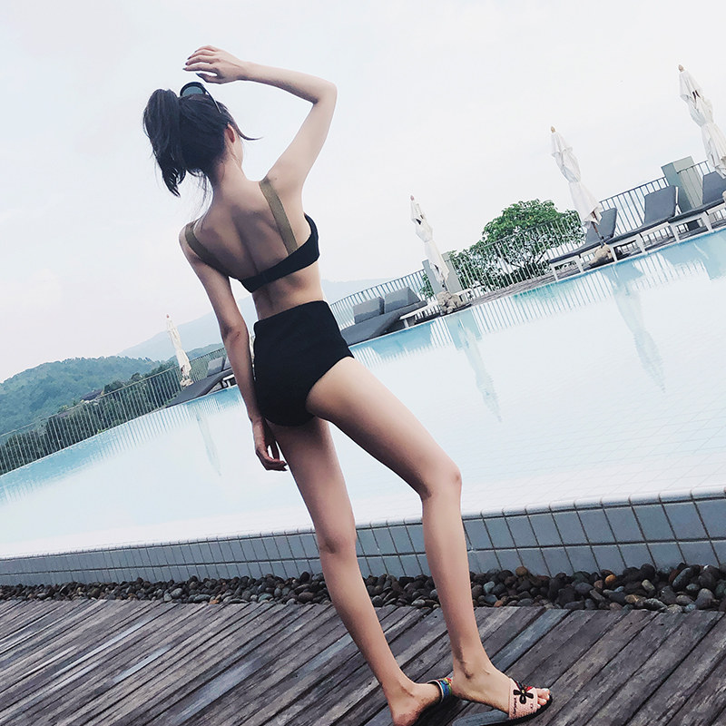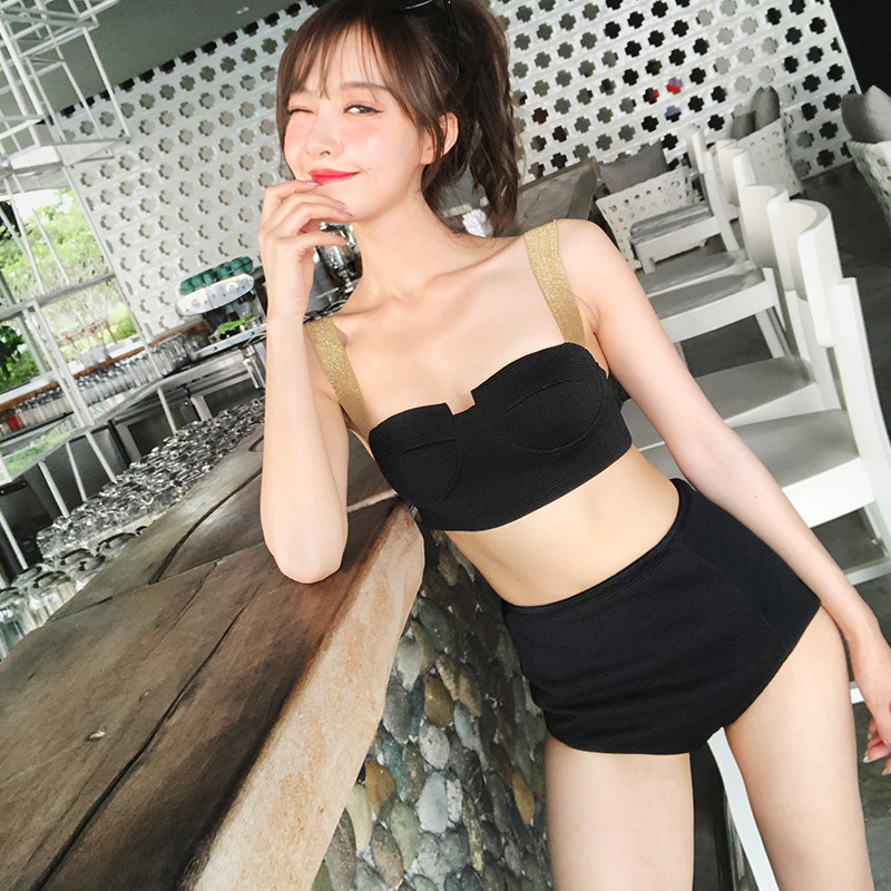 Net red swimsuit woman two-piece black retro high waist display slim cover with small breasts to woo sexy ins Korean spa