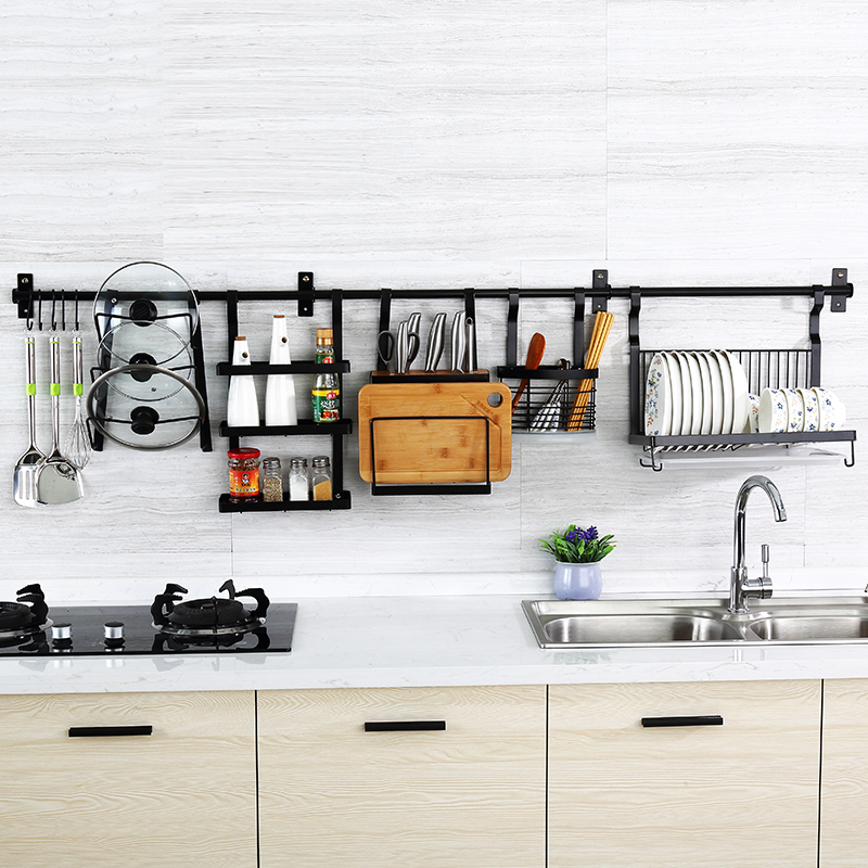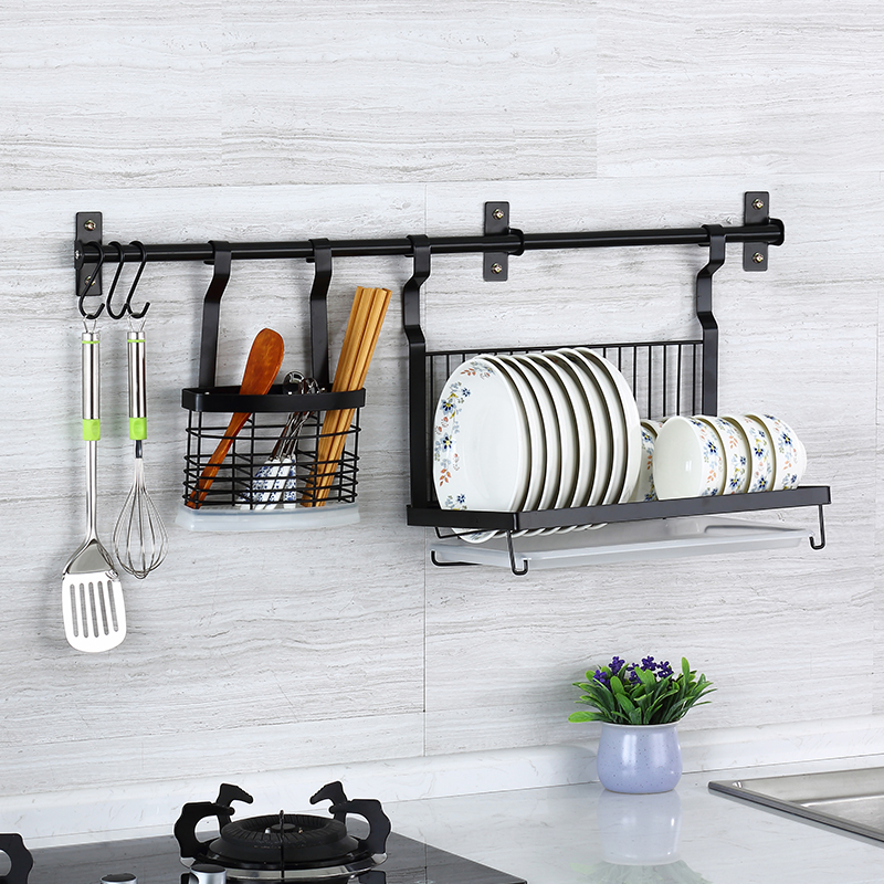 Stainless steel kitchen shelf wall-mounted non-perforated storage knife holder pendant bowl rack drain rack hanging rod hook black