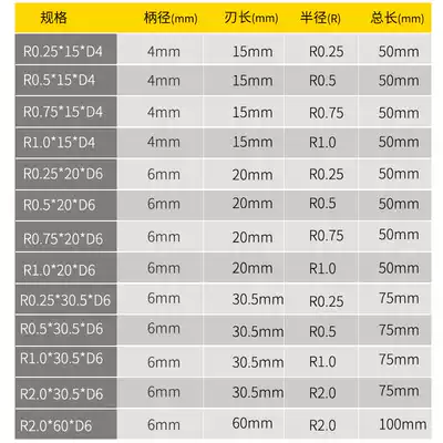 Radius*Blade length*Shank diameter*Total length R0 25*15*D4*50 R0 5*15*D4*50 R0 75*15*D4*50 R1 0