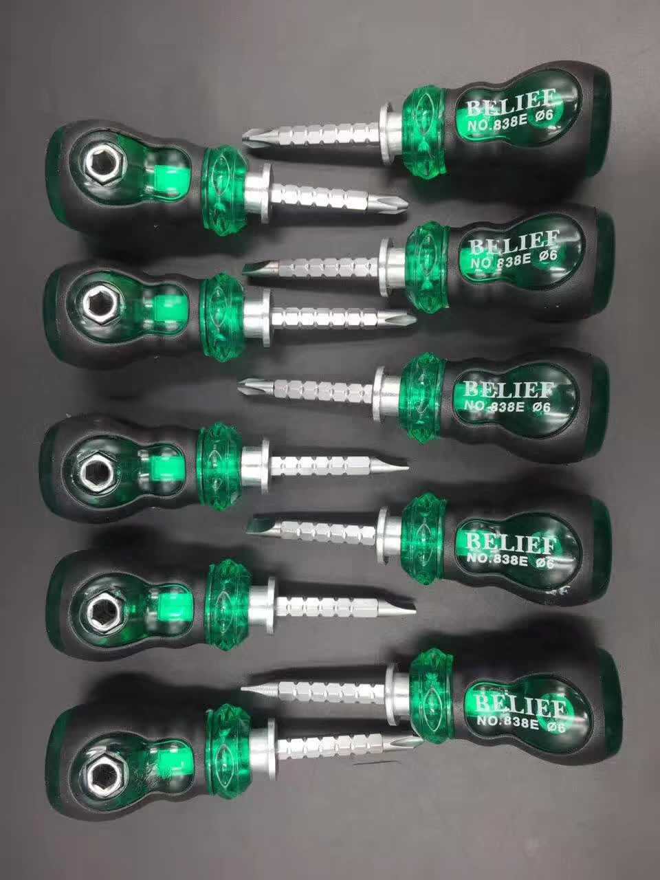 One short three-purpose screwdriver, one long three-purpose screwdriver, ten short ones each