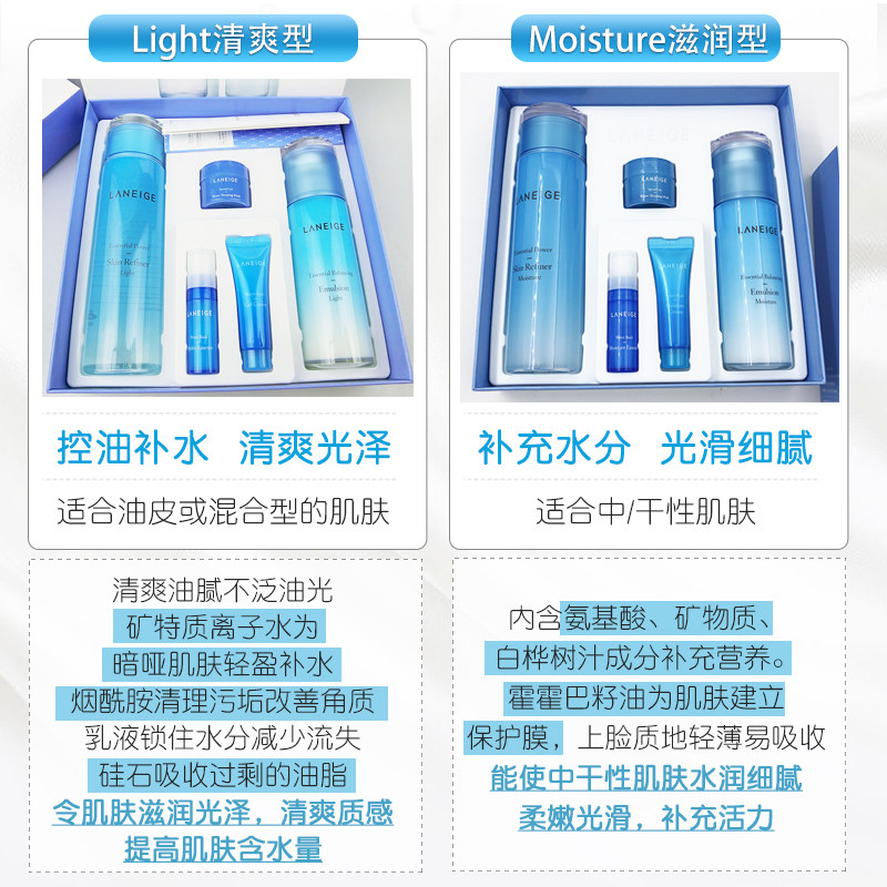 Light type (suitable for oily and mixed skin) Moisturizing type (suitable for dry skin) Water + cream + cream (light type) Water + lotion + cream (moist type) Water + lotion + essence (light type)