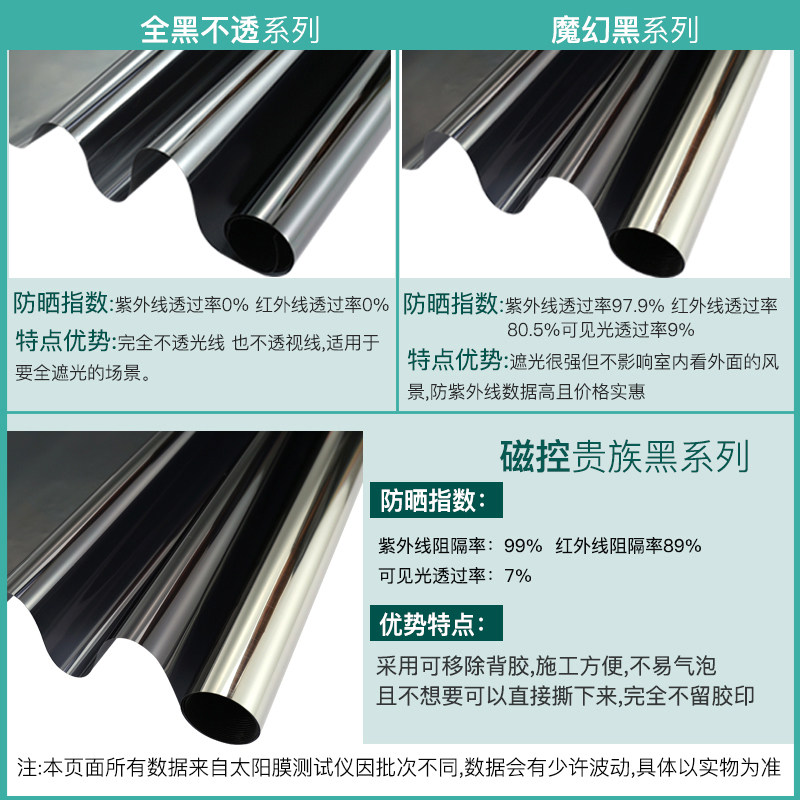 Magic black (very shading) (price per 1 meter long) buy multiple pieces and ship together Interstellar blue (a little shading) (price per 1 meter long) buy multiple pieces and ship together, all black and opaque (completely shading)