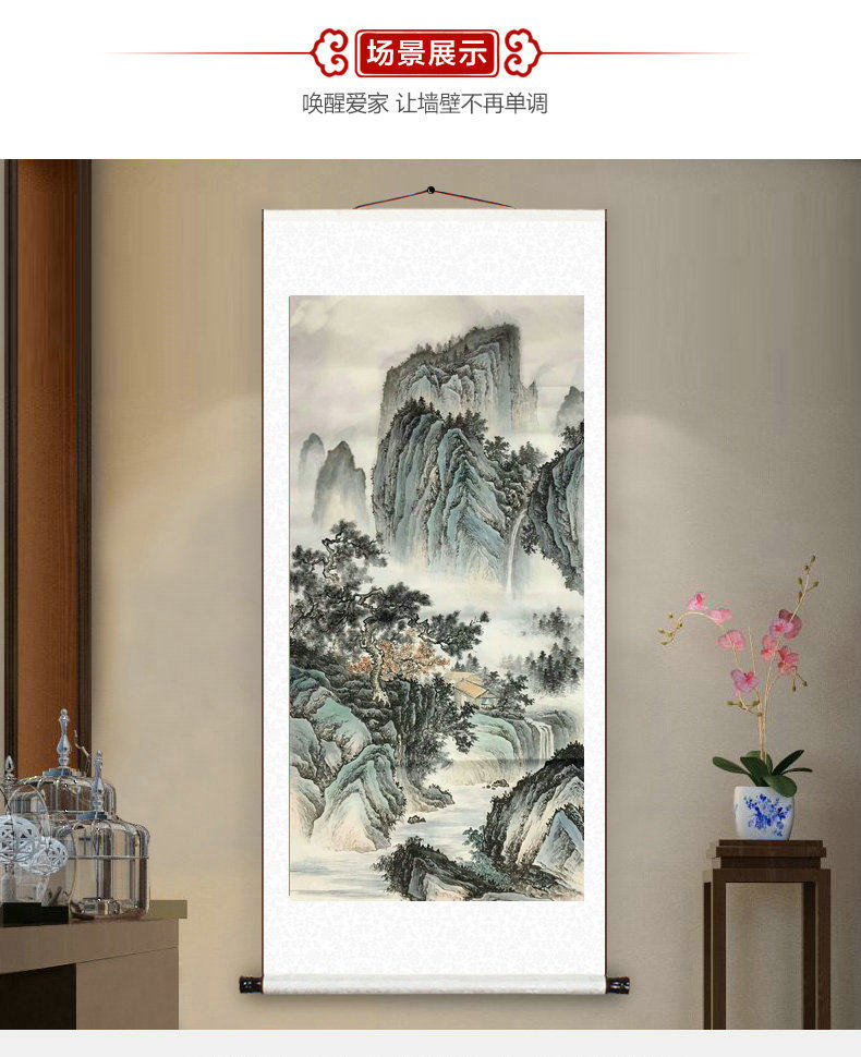 Hand drawing 4-ruler midway antique Chinese landscape country painting Water ink green Xuan paper painting Core Xuanguan Corridor decorative calligraphy and painting