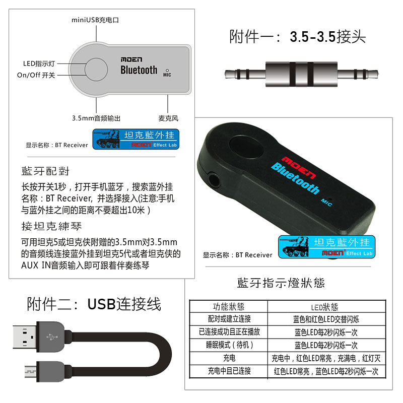 Magyin MOEN Bluetooth Receiver Electric Guitar Tank Blue External AUX Bluetooth effector speaker sound connection