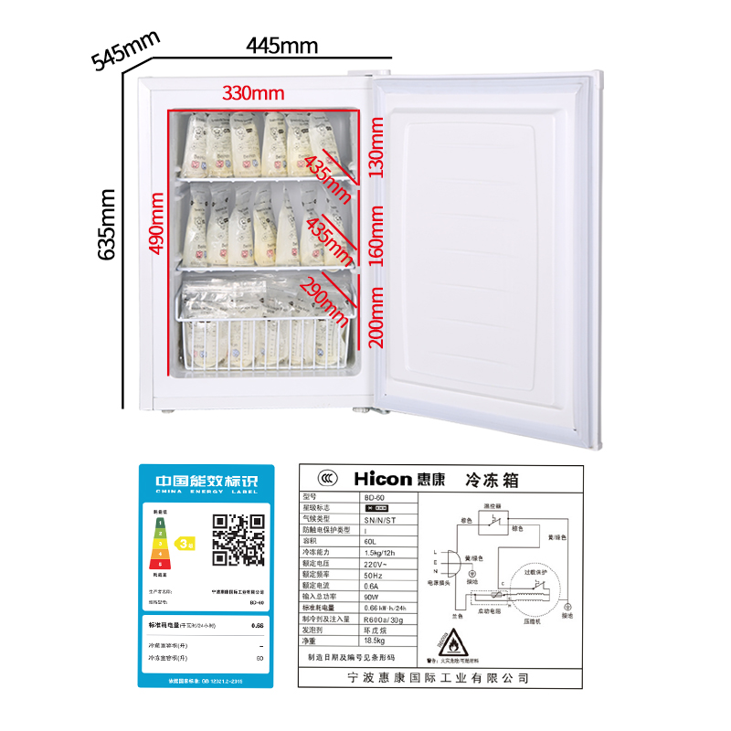 Weikang 60L refrigerator household small commercial large - capacity full - freezer vertical refrigerator side open door breast refrigerator