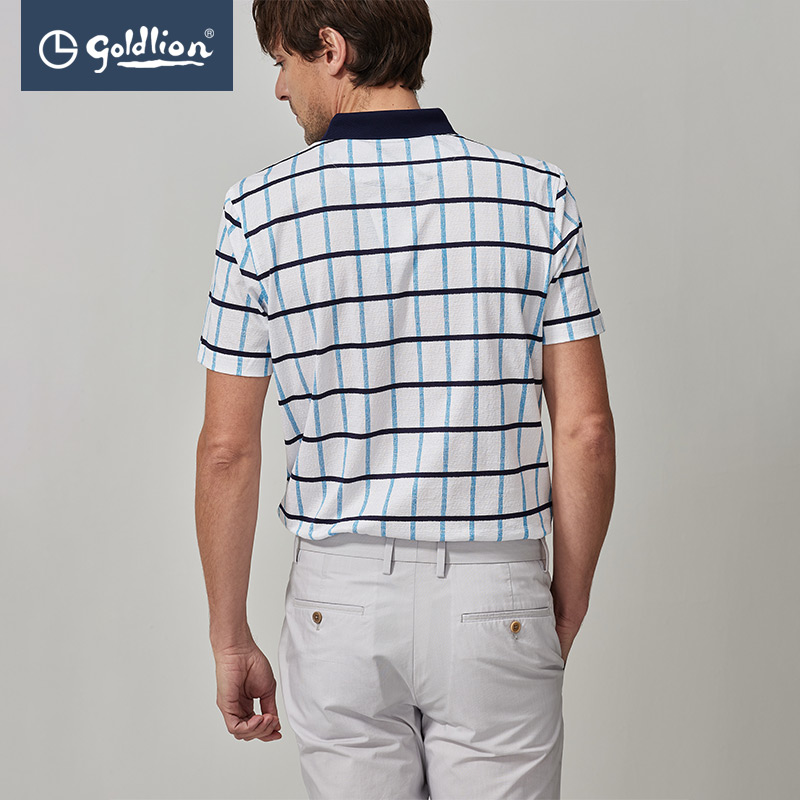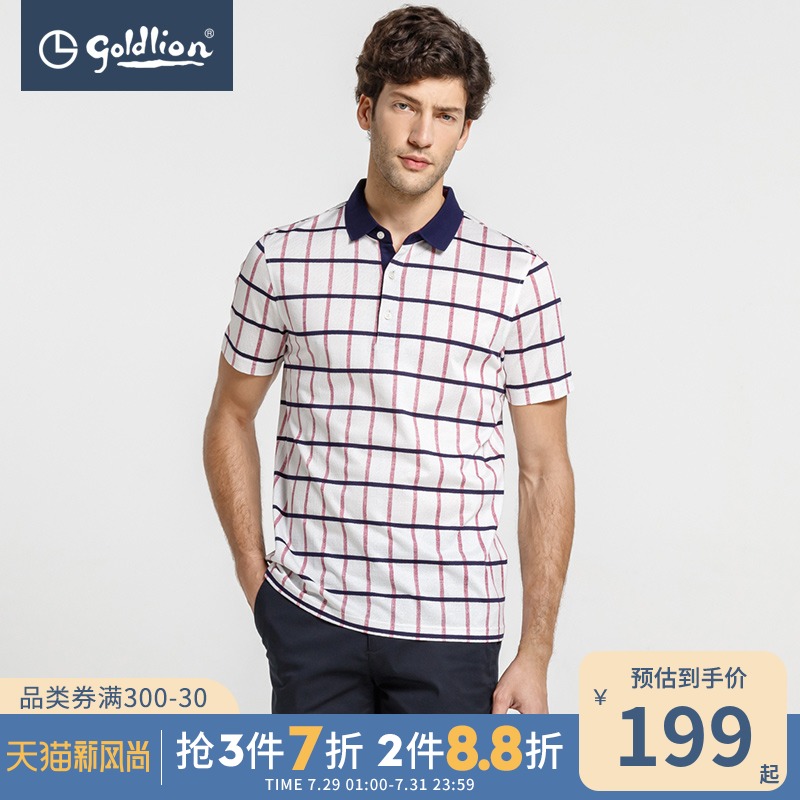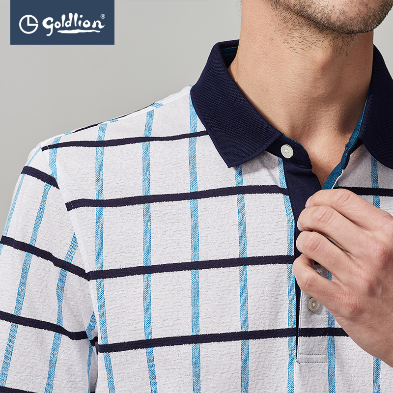 Jinlilai 2020 season new men's cotton blended fashion check stitching lapel casual short-sleeved T-shirt (Hui)