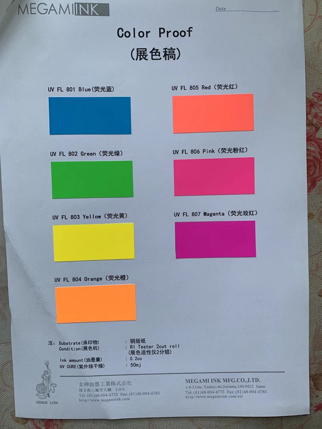 P801 fluorescent blue P802 fluorescent green P803 fluorescent yellow P804 fluorescent orange P805 fluorescent red P806 fluorescent pink P807 fluorescent rose red UV cooling agent (diluted ink) Japanese goddess special UV fluorescent spot color